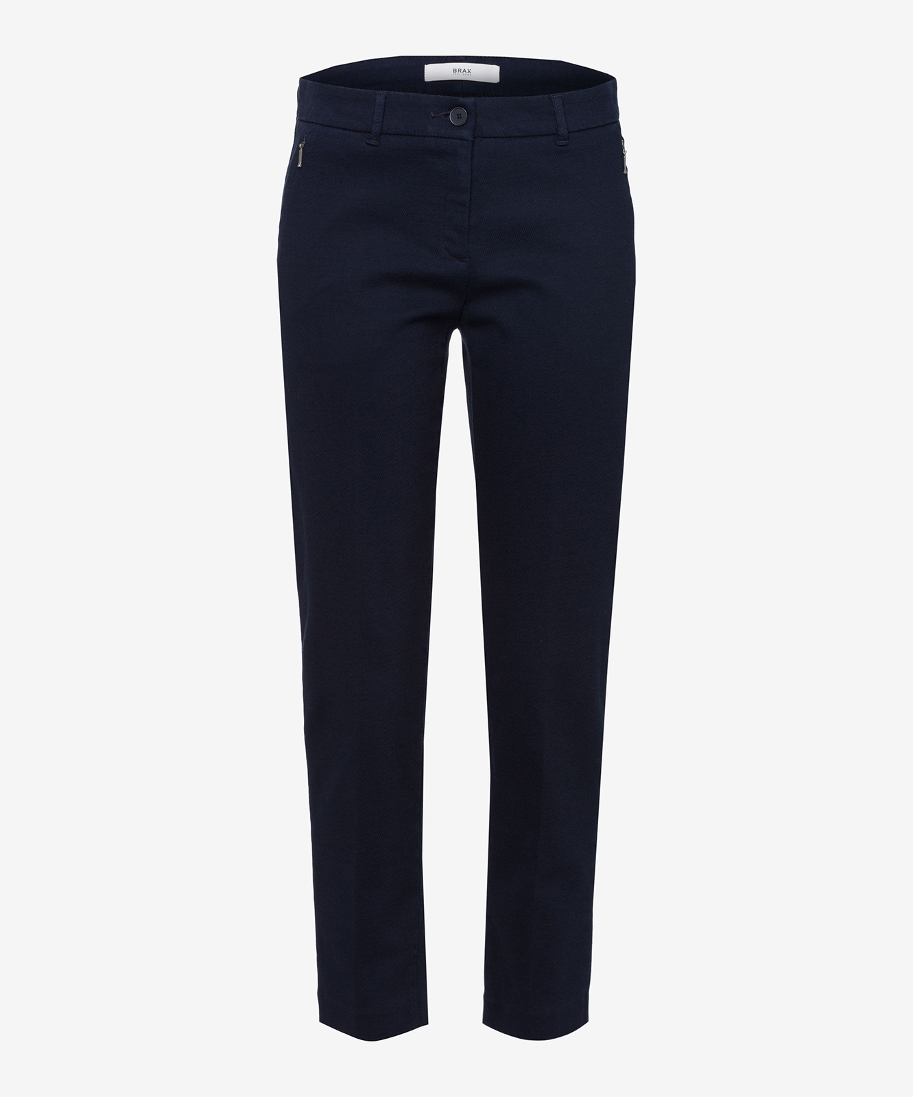 Укороченные брюки в темно-синем оттенке. Комфортная средняя посадка, притачной пояс со шлевками, застежка на скрытую молнию и пуговицу. Брюки можно удачно сочетать с рубашкой, джемпером или жакетом.