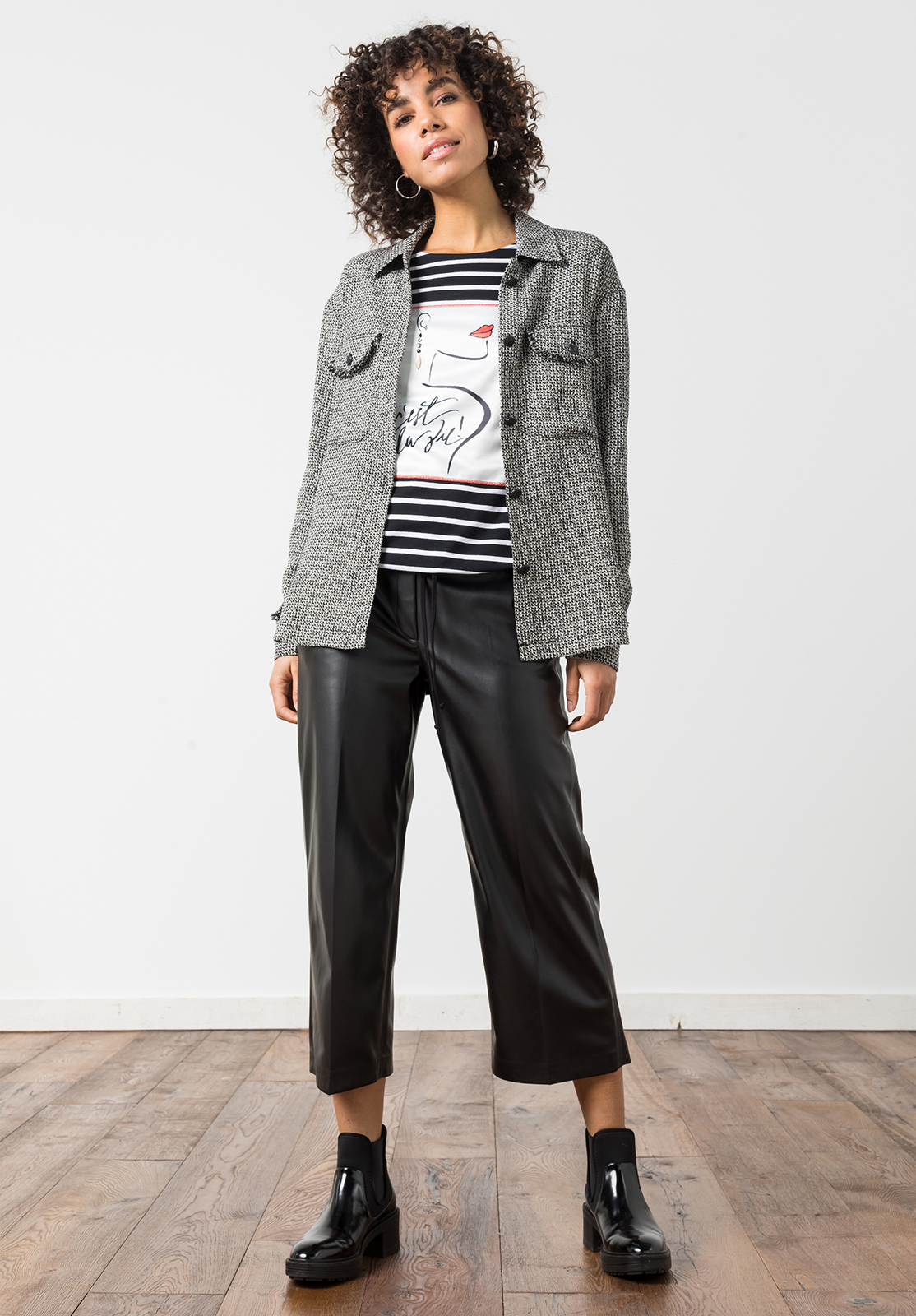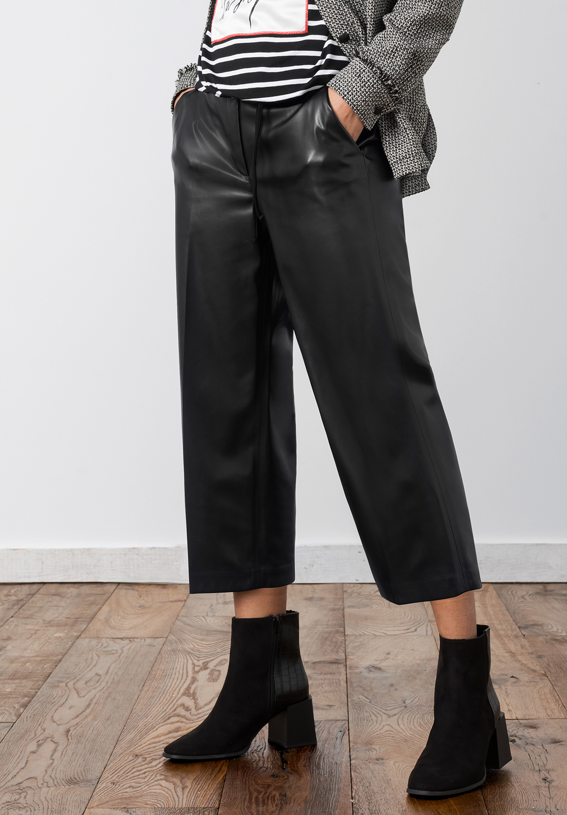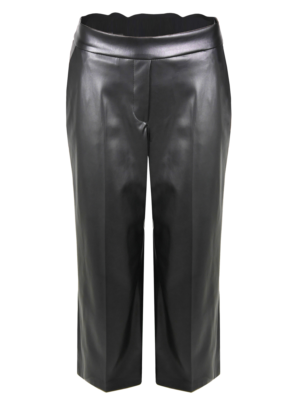 Кюлоты из экокожи свободного кроя. Комфортная высокая посадка, эластичный притачной пояс. Боковые карманы. Кюлоты – актуальная модель брюк, с которой можно составить различные образы в повседневном и официальном стиле.