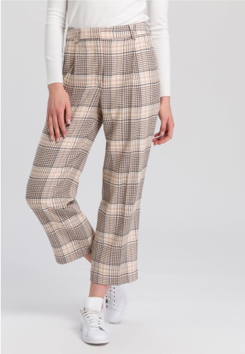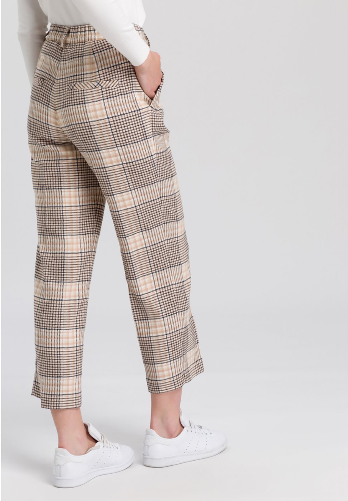 Укороченные клетчатые брюки высокой посадки. Боковые карманы, прорезные карманы с листочкой сзади. Застежка-молния. Трендовый вариант низа для актуальных образов.