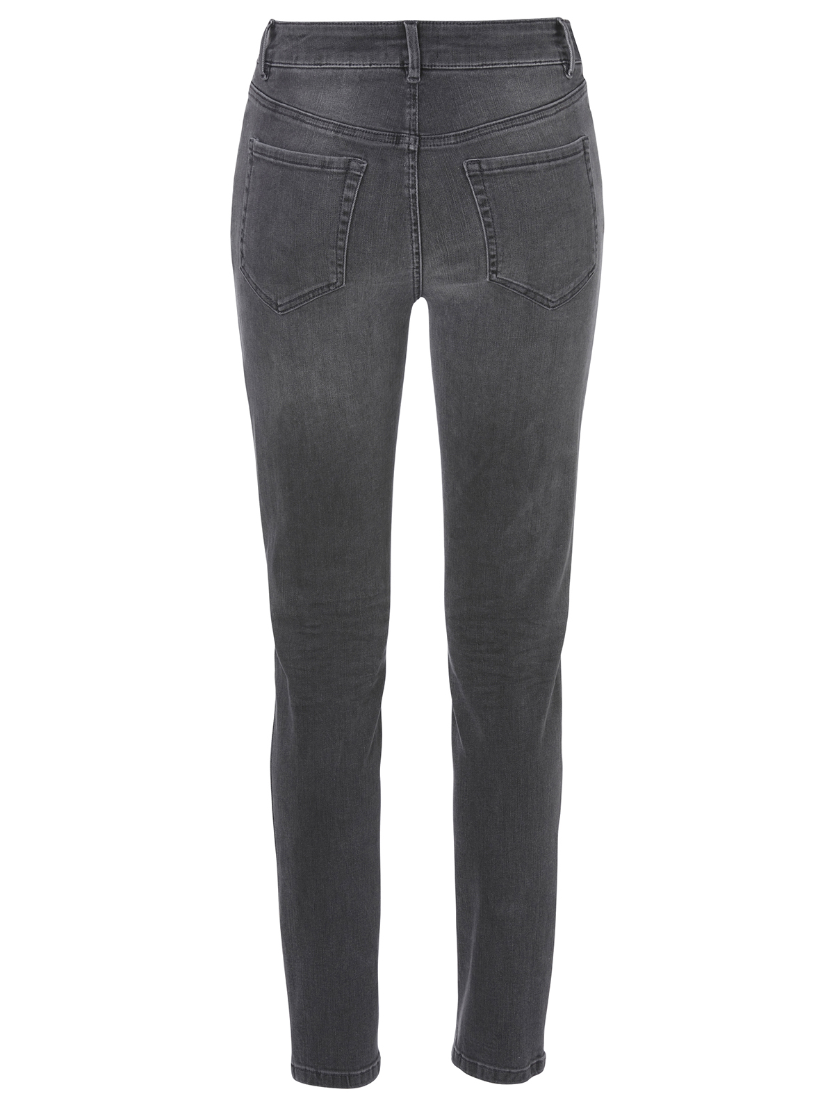 Серые джинсы силуэта slim. Декоративные потертости и складки. Комфортная высокая посадка, притачной пояс со шлевками. Застежка на пуговицу и скрытую молнию. Внутренние боковые карманы и два накладных кармана сзади.