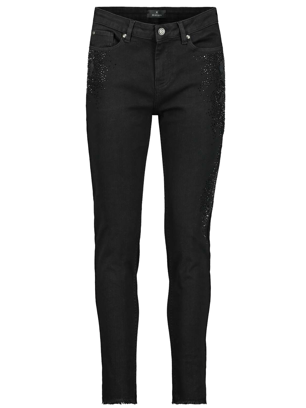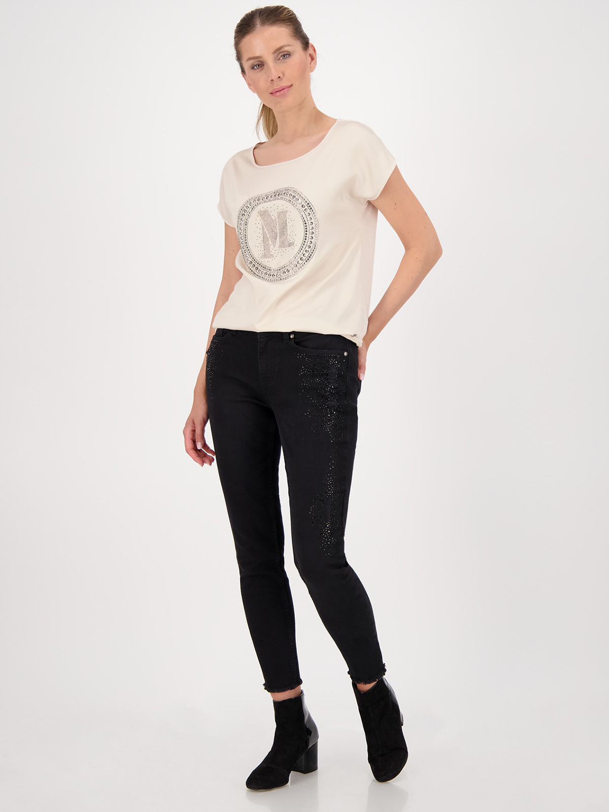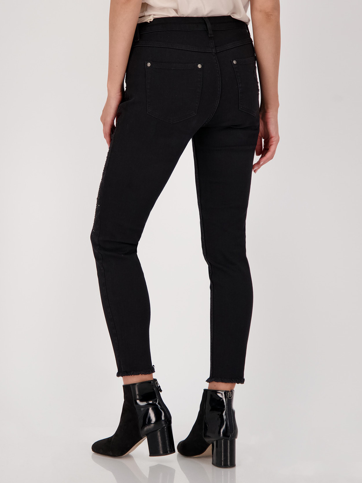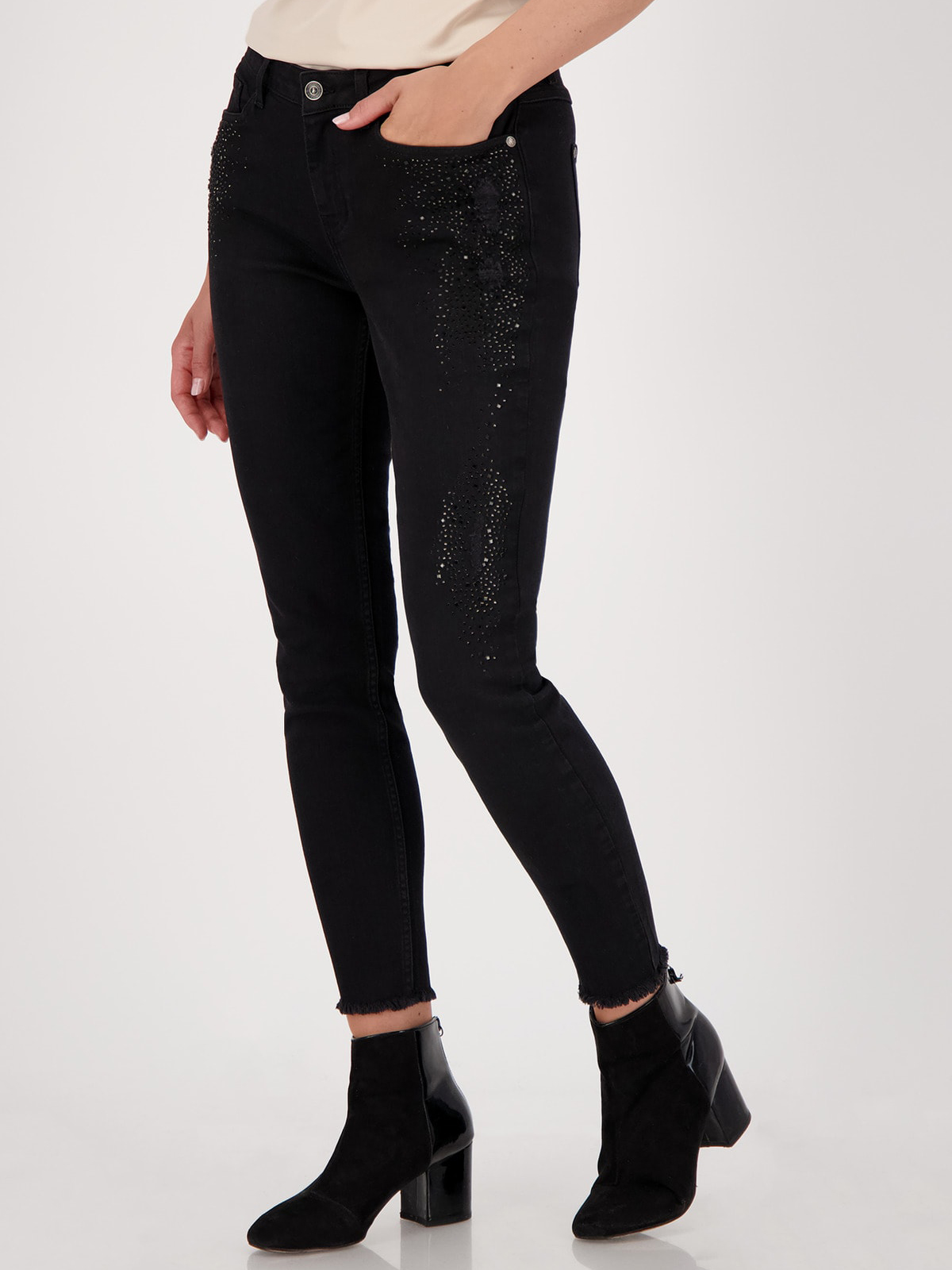 Однотонные джинсы силуэта slim с необработанным краем брючин. Комфортная средняя посадка, притачной пояс со шлевками. Застежка на пуговицу и скрытую молнию.
