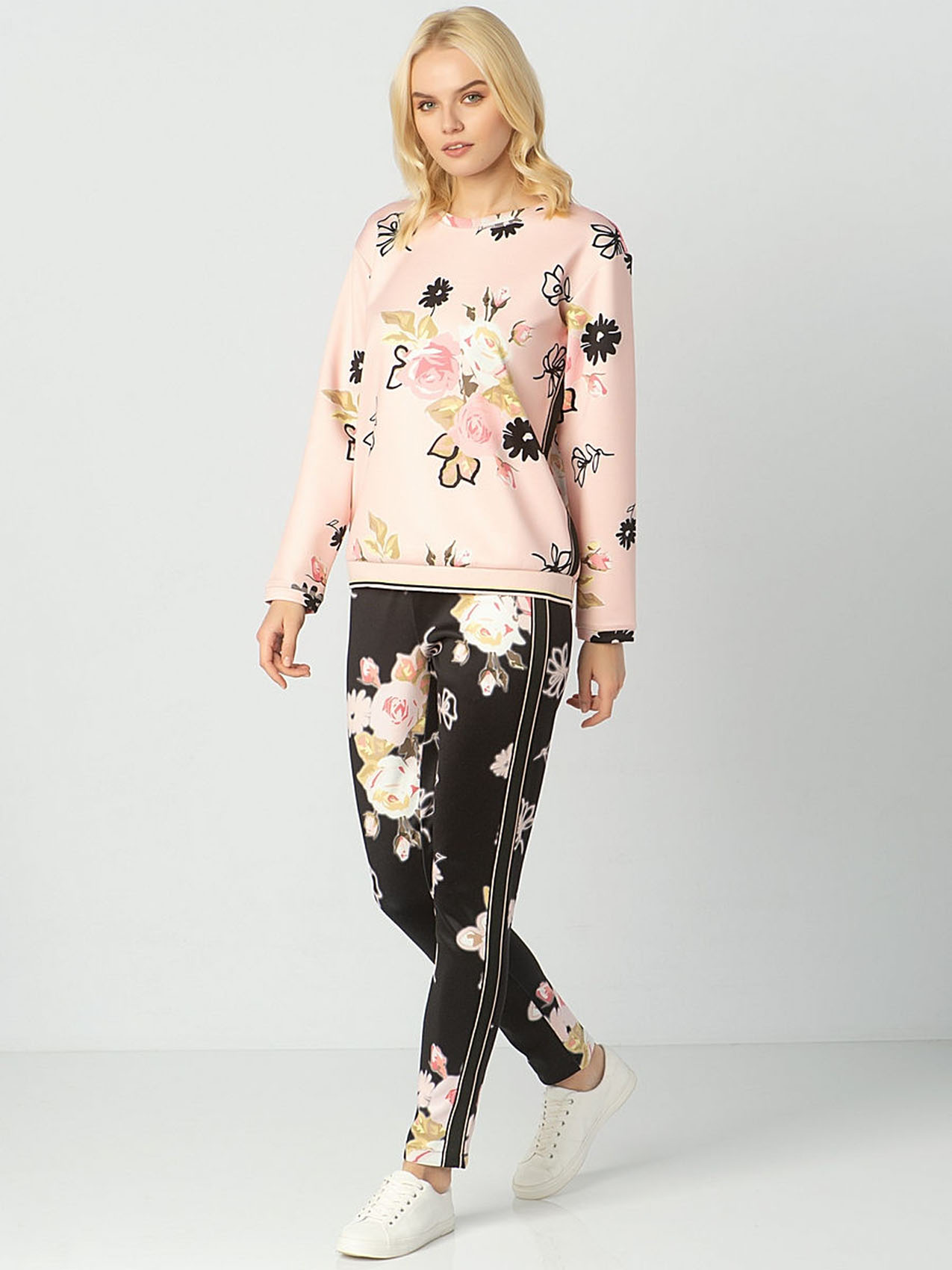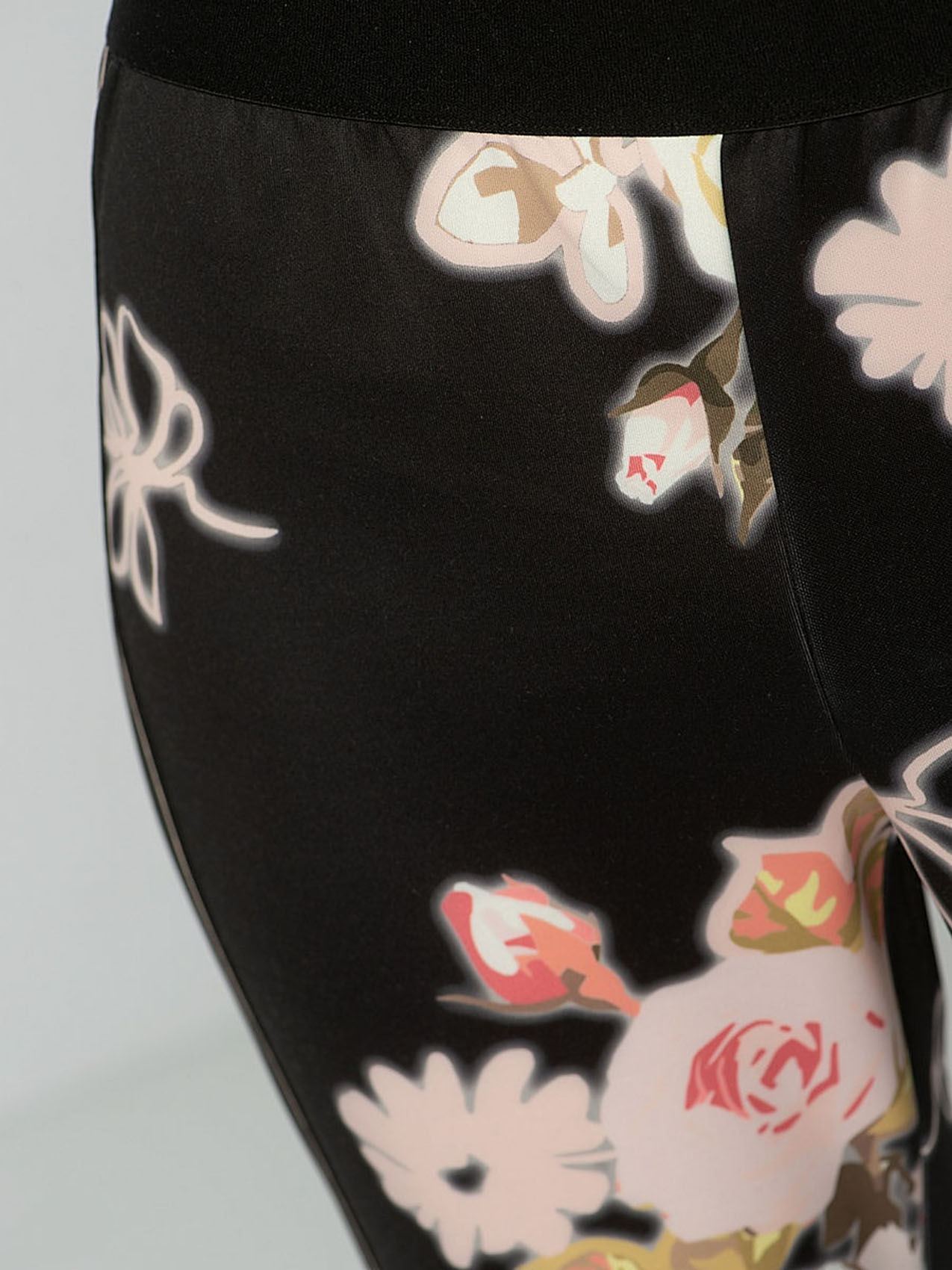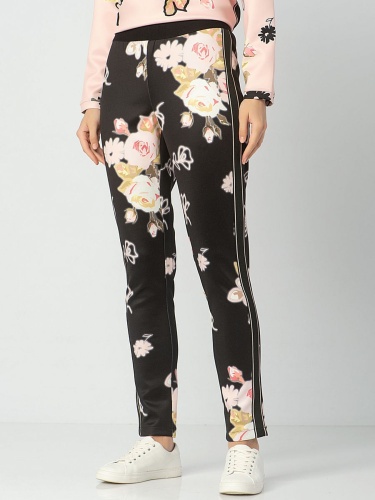 Брюки с цветочным принтом. Силуэт slim подчеркивает линию ног. Приятный к телу трикотаж. Декоративные ленты по бокам.