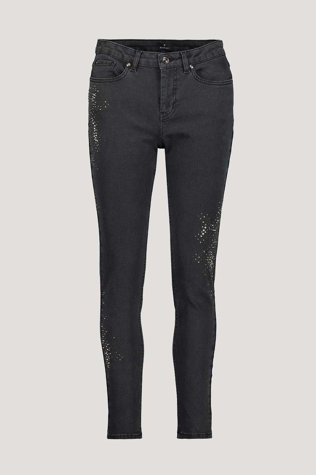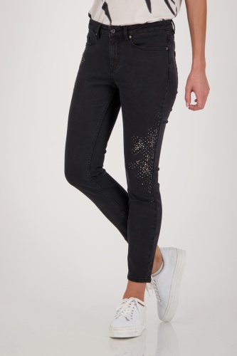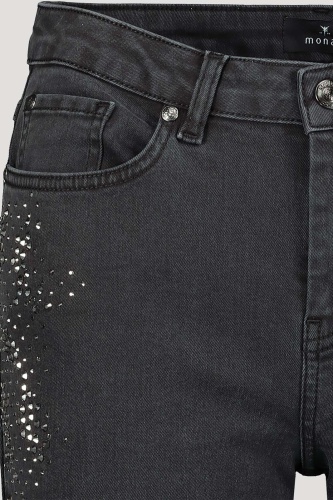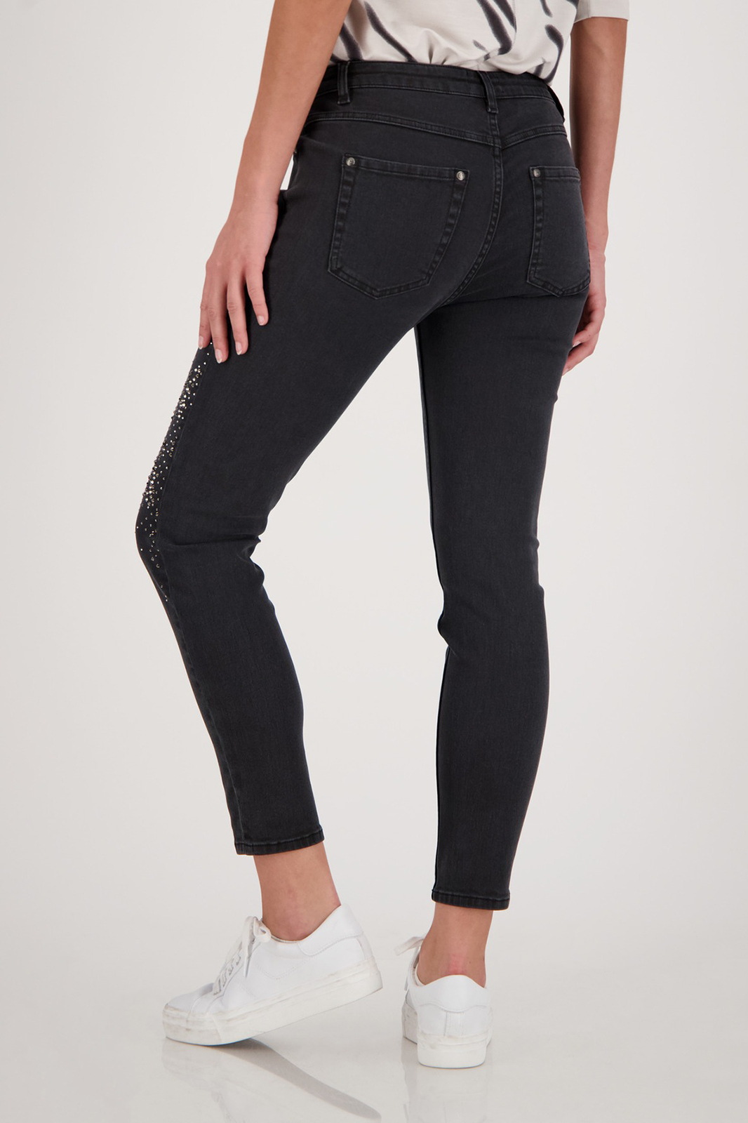 На сайте указаны Российские размеры. Черные зауженные джинсы со стразами. Длина 7/8 оголяет щиколотки, визуально удлиняя ноги. Комфортная высокая посадка, пояс со шлевками. Внутренние передние карманы и накладные карманы сзади.