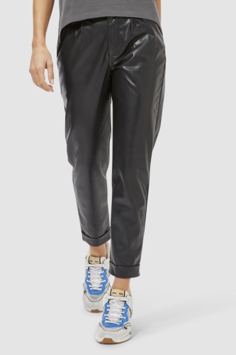 Укороченные брюки из экокожи свободного кроя. Дизайн включает удобные боковые карманы, практичные шлевки для ремня и застежку-молнию. Носите с женственными блузками и лодочками, чтобы создать шикарный деловой образ или с белыми кроссовками и футболкой для городского кэжуал стиля.