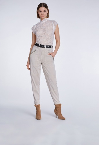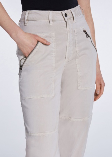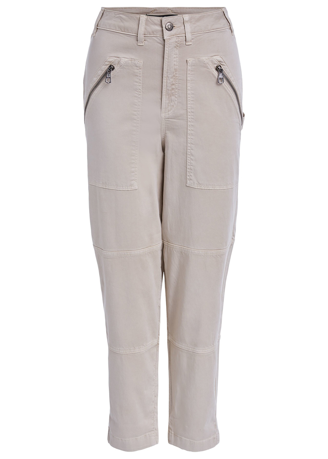 Однотонные брюки прямого кроя с рельефами. Комфортная высокая посадка, пояс со шлевками, застежка на скрытую молнию и пуговицу. Накладные передние карманы на молнии.
