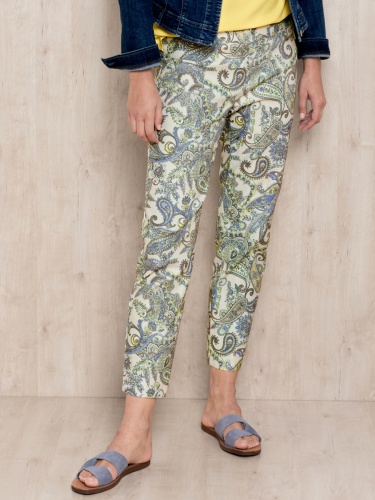 Укороченные брюки выполненные в узоре пейсли - яркий вариант низа на теплый сезон. Ткань из смесового льна приятна к телу и гарантирует долговечность изделия. Притачной пояс без шлевок, боковые карманы.