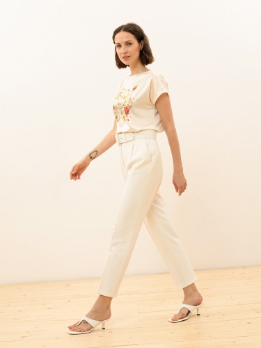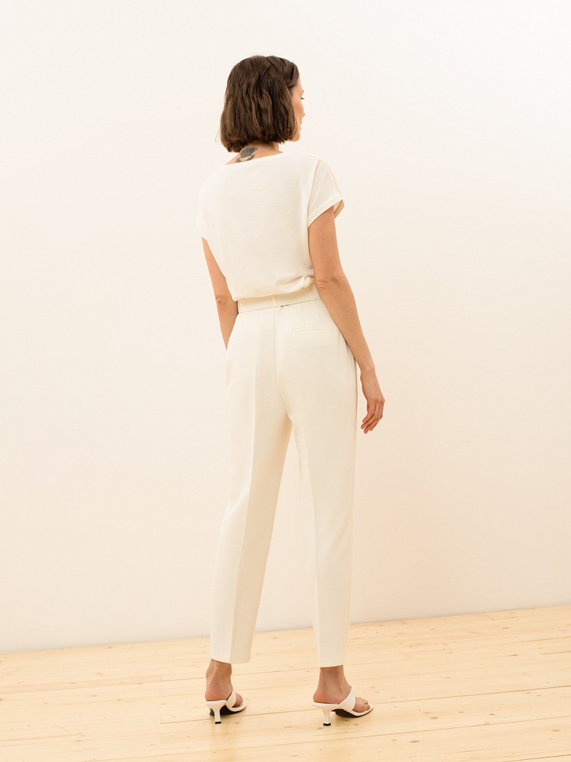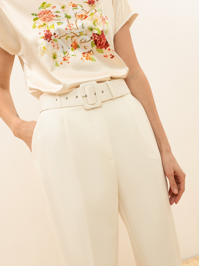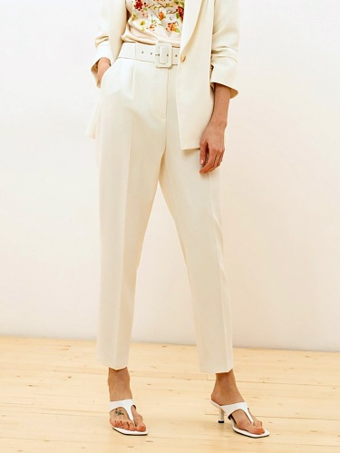 Однотонные классические брюки с высокой посадкой - элемент базового делового гардероба. Идеально подходят для офиса или повседневного ношения. Длина 7\8 оголяет щиколотку и визуально стройнит силуэт, а стрелки вытягивают рост. Застежка на молнию и брючный крючок. В комплекте идет широкий ремень с пряжкой, обтяжные основной тканью изделия.