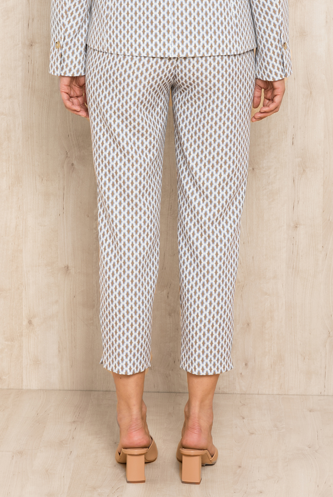 Укороченные брюки в геометрическом узоре – идеально сочетаются с жакетом из того же материала или могут быть самостоятельной деталью образа. Комфортная средняя посадка, пояс без шлевок. Швы спереди на штанинах. Застежка на две пуговицы и скрытую молнию.