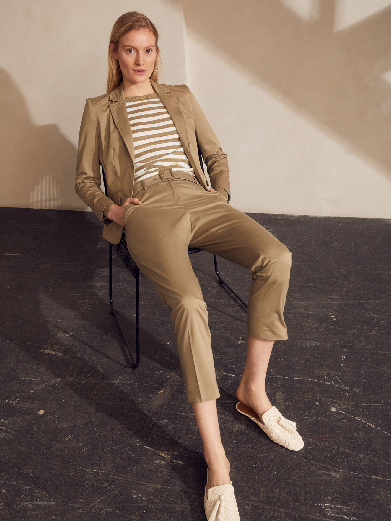 Укороченные хлопковые брюки хорошо смотрятся как с повседневной полосатой рубашкой, джинсовой курткой и кроссовками, как и с элегантной атласной блузкой, пиджаком и каблуками. - прямой крой - скрытая передняя застежка - декоративный тканевый пояс - притачной пояс и шлевки для ремня - боковые карманы - внутренняя длина ноги по размеру 42 = 74 см
