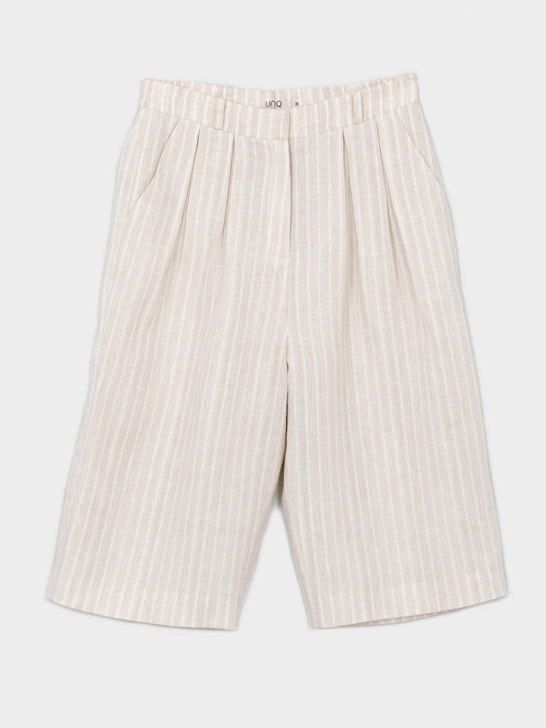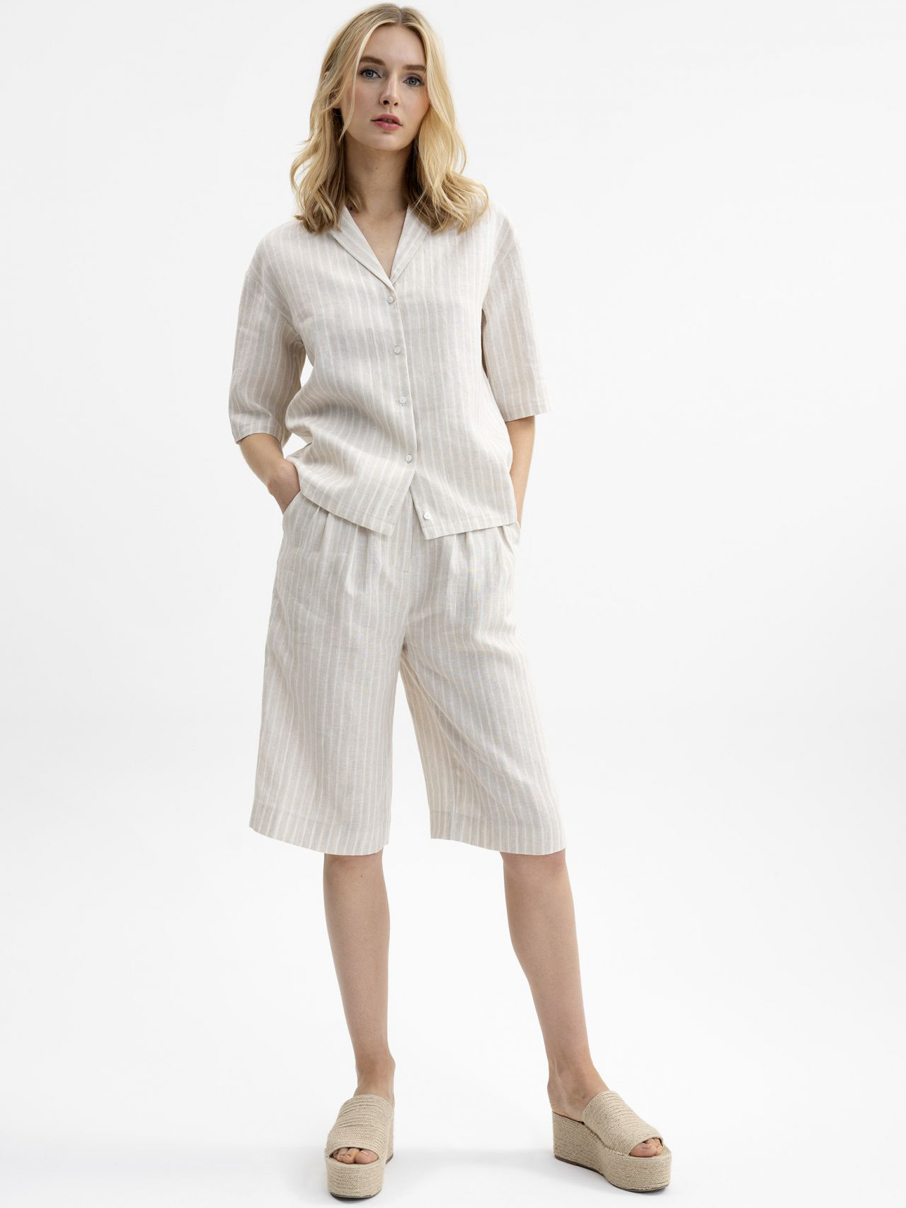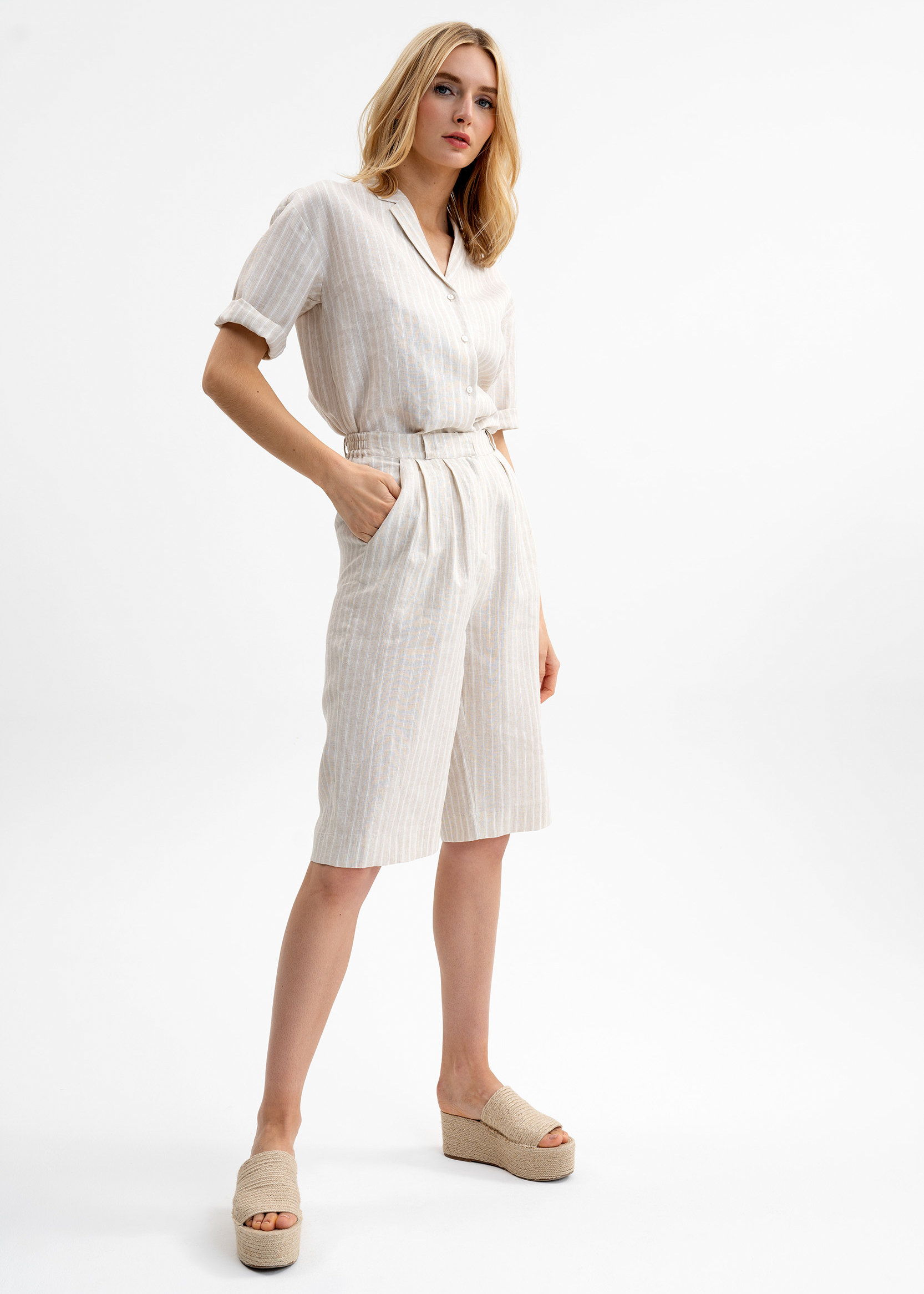 Шорты из 100%-го льна – всегда актуальная летняя классика городского повседневного стиля. Высокая посадка и фигурные вытачки обеспечивают комфортное ношение. Пояс со шлевками для фиксации ремня. Прорезные боковые карманы.
