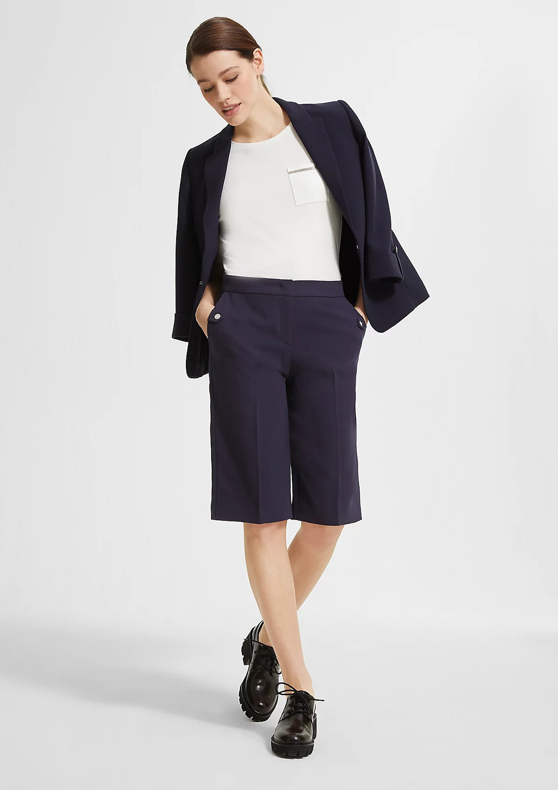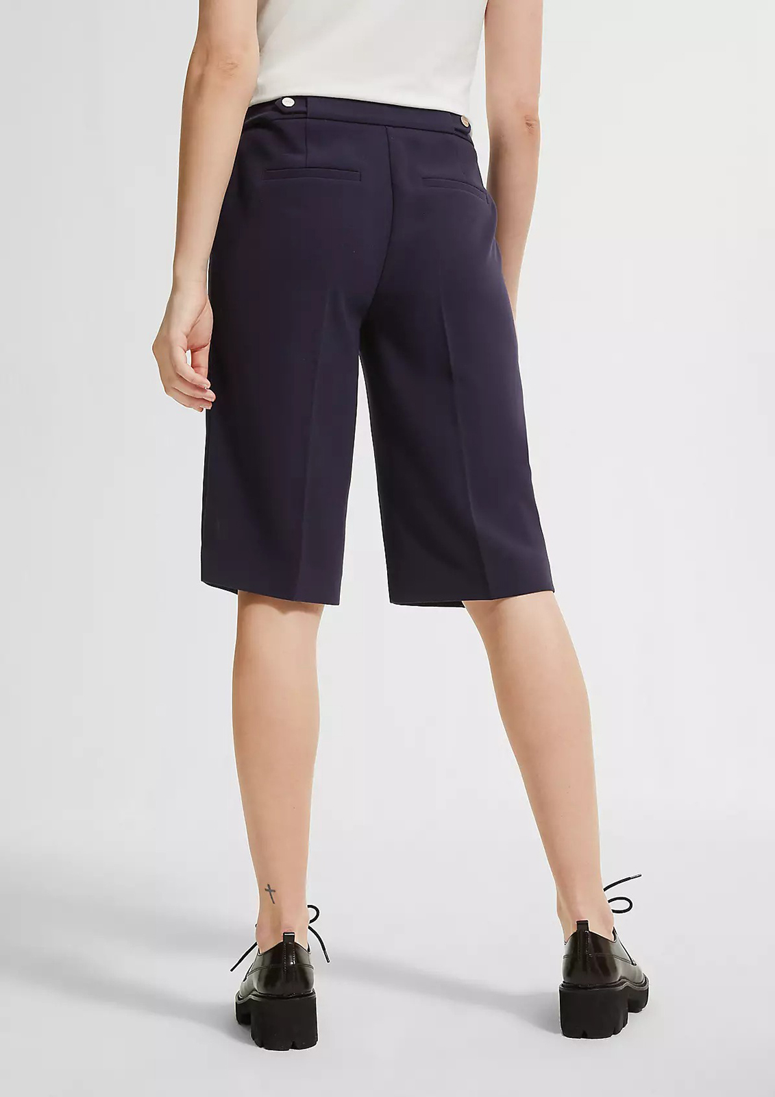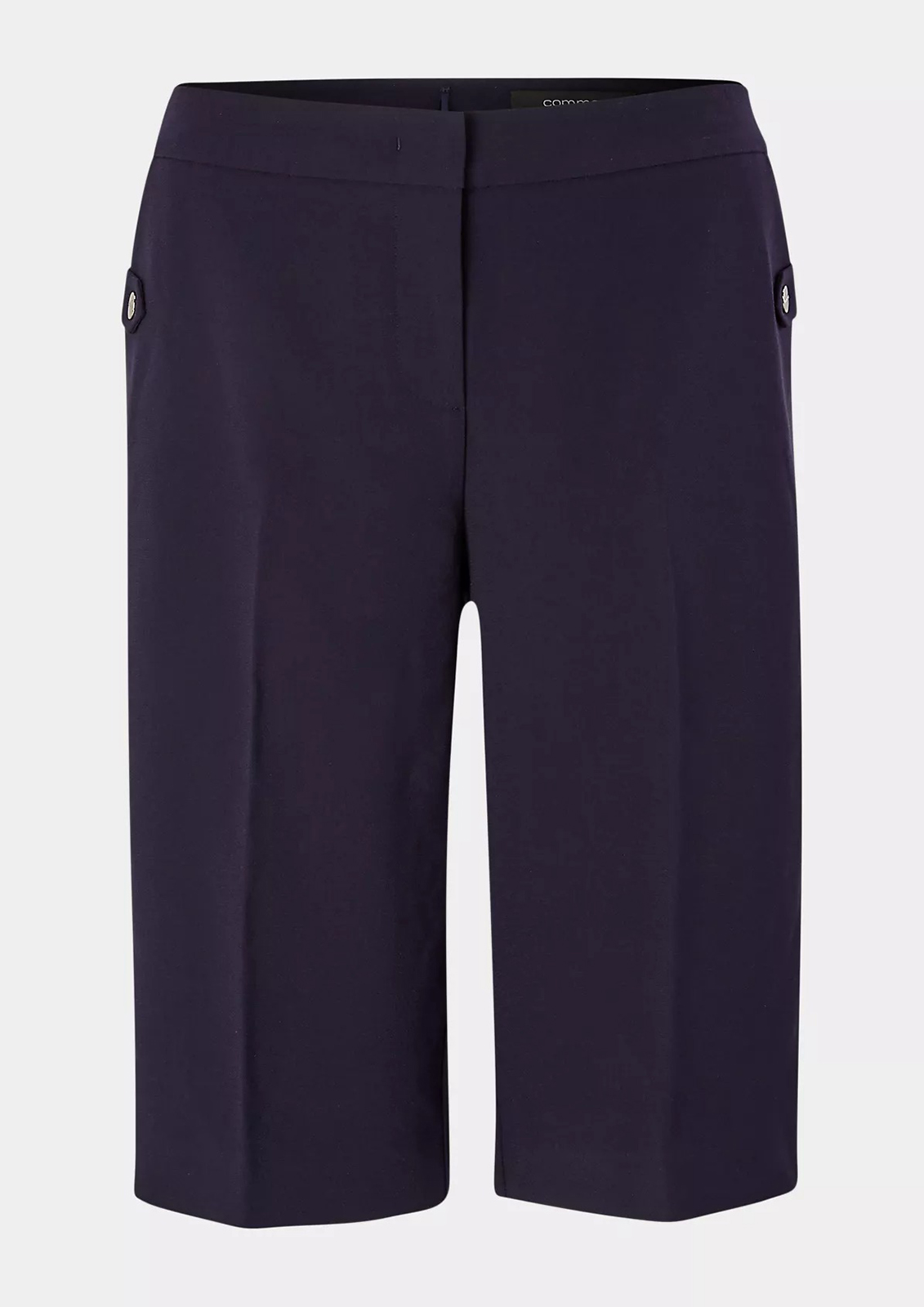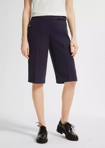 Однотонные шорты в базовом темно-синем оттенке – идеальный вариант низа для повседневного образа в теплое время года. Длина до колена позволяет надеть шорты в офис или на встречу, если сочетать с верхом в деловом стиле. Комфортная высокая посадка. Застежка на скрытую молнию и пуговицу. Боковые карманы в шве, сзади прорезные карманы с листочкой.