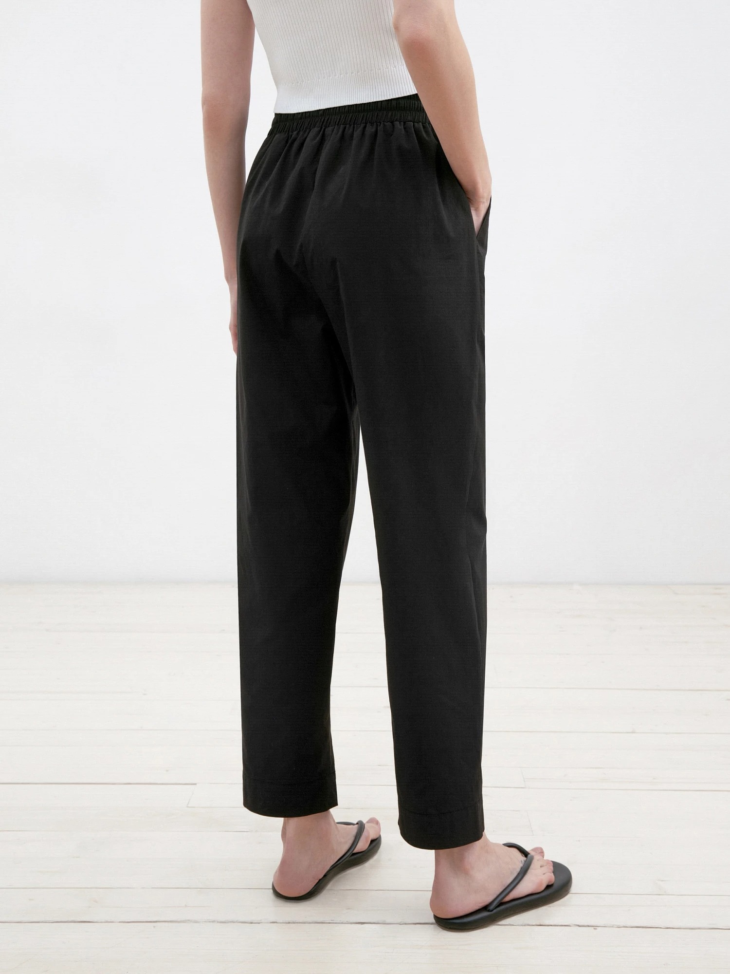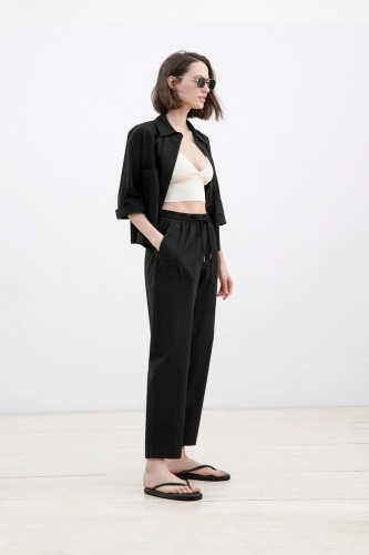 Стильные брюки из хлопковой ткани трендового силуэта бананы с резинкой и завязками на талии для комфортной посадки и крупными отстроченными карманами.