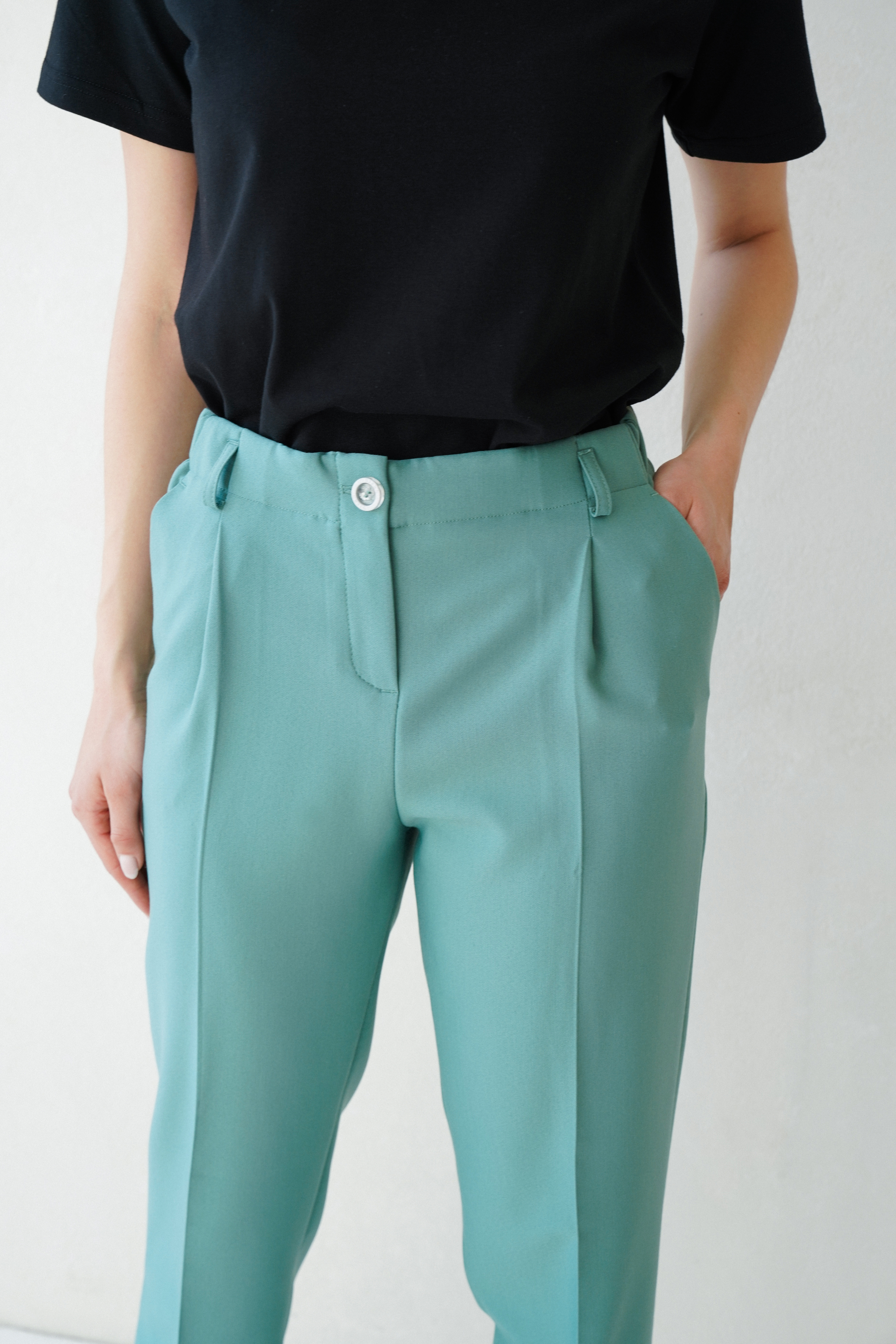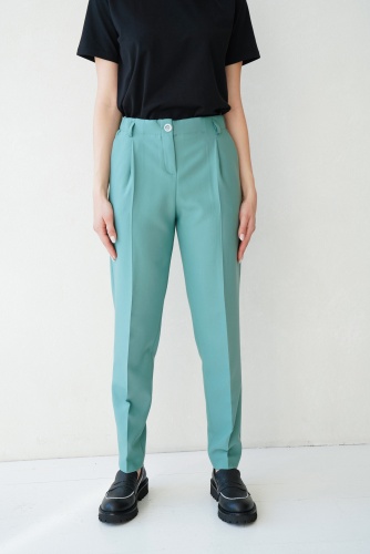 На сайте указаны российские размеры. Ткань: смесовая ткань средней плотности (68% полиэстер, 28% вискоза, 4% эластан) Крой: классическая модель прямого силуэта со стрелками, изящными защипами и удобными функциональными карманами. Средняя посадка гармонизирует силуэт, подчеркивает талию и скрывает возможные недостатки в области живота и бедер. Отделка: стрелка визуально удлиняет силуэт, делая его более подтянутым. Застегиваются на оригинальную пуговицу с жемчужным сиянием. Сзади два прорезных кармана. Имеют шлевки, что позволяет дополнять образ ремнем.