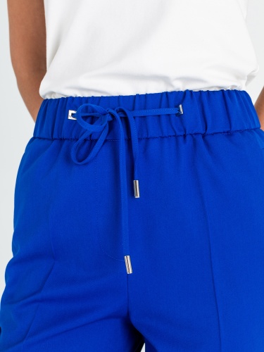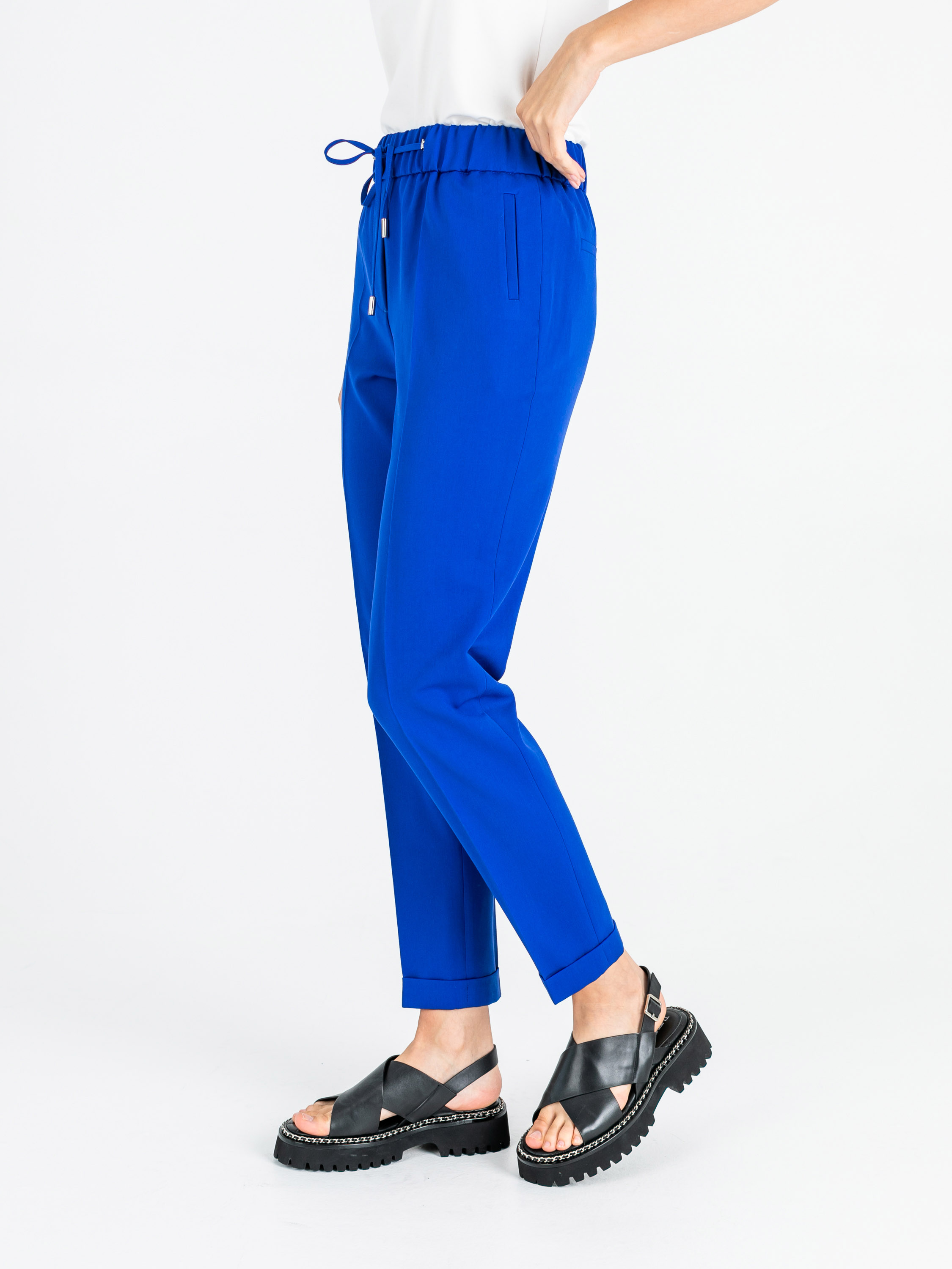На сайте указаны российские размеры. Ткань: смесовая ткань средней плотности (72% полиэстер, 22% вискоза, 6% эластан). Идеальны для лета и весны. Крой: повседневные брюки в стиле спорт-шик – выбор активных женщин, для которых важен не только комфорт, но и внешний вид одежды. Имеют слегка прилегающий силуэт, подчеркивающий красоту фигуры. Модель с завышенной талией, прикрывает зону живота. Удобный пояс-резинка обеспечивает максимальный комфорт и надевание брюк в течение нескольких секунд. Отделка: модель с двумя функциональными прорезными карманами спереди и двумя карманами сзади. Стрелка на брюках «снижает» градус спорта и добавляет женственной повседневности. Манжеты подчеркивают красоту щиколоток, а тонкий шнурок с серебряными концами позволяет регулировать ширину пояса. Параметры модели: 86-61-91 см Рост 177 см