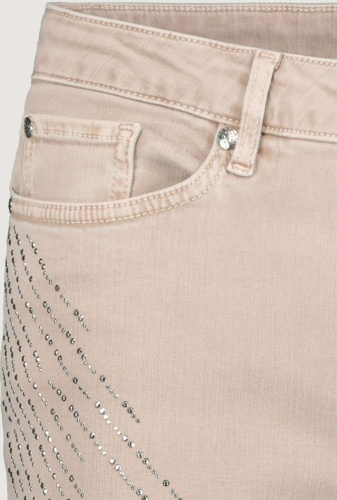 На сайте указаны российские размеры. Узкие джинсы с пятью карманами и эффектными стразами. Узкий крой с петлями для ремня на поясе, классическая посадка и пять карманов. Низ штанин украшен стильной бахромой, а сверкающие полоски со стразами эффектно украшают модель. Параметры модели: 42 размер, рост 179 см