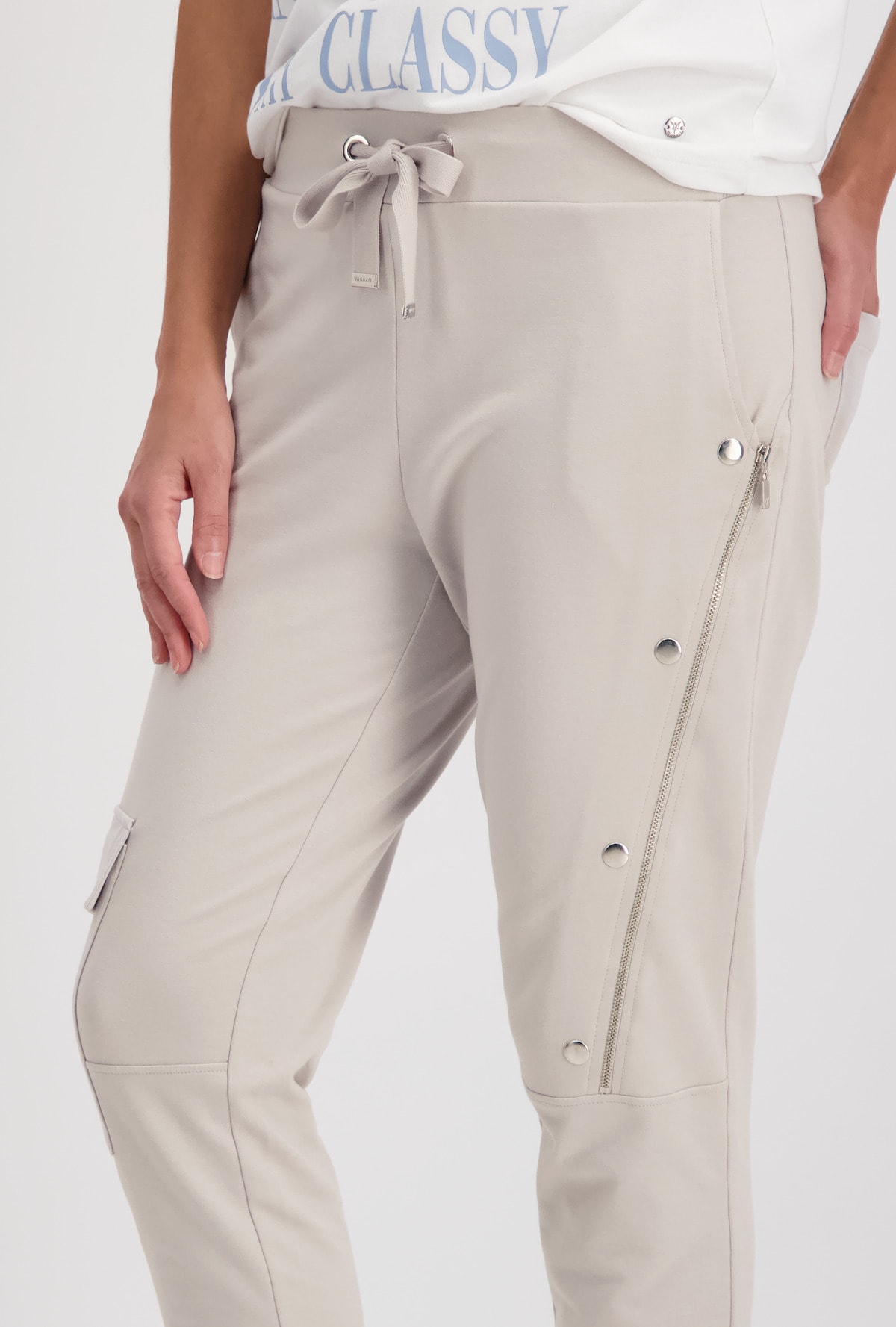 На сайте указаны российские размеры. Спортивные джоггеры monari в байкерском стиле. Пояс украшен декоративными пуговицами, талия на кулиске с проушинами и завязками, а также ребристая спинка. Боковые карманы, накладной карман с клапаном на уровне колена на правой штанине и диагональный шов с застежкой-молнией и декоративными пуговицами на левой штанине завершают дизайн довольно простой модели джоггеров. Параметры модели: 42 размер, рост 179 см