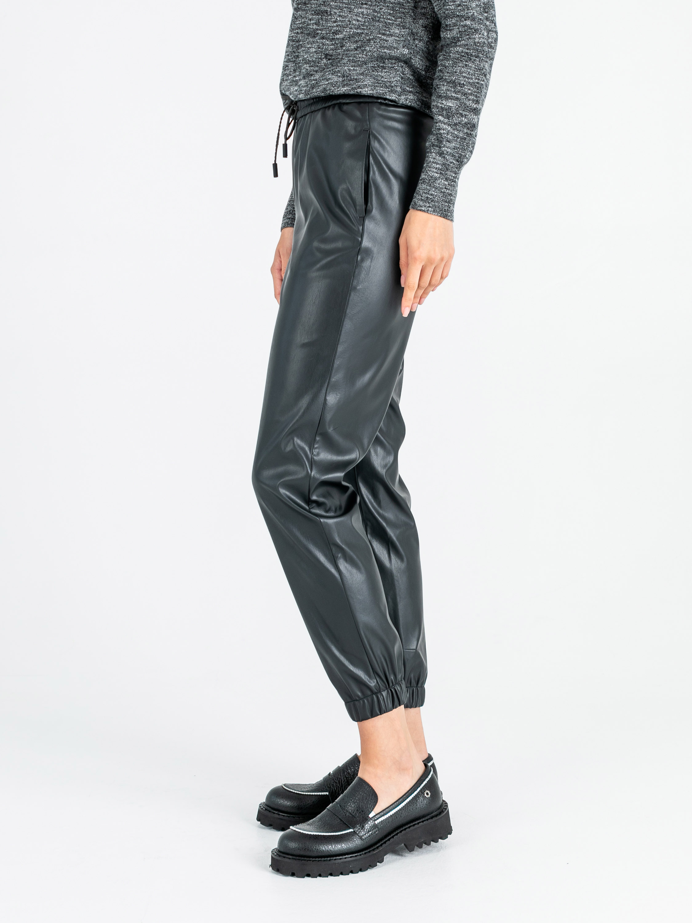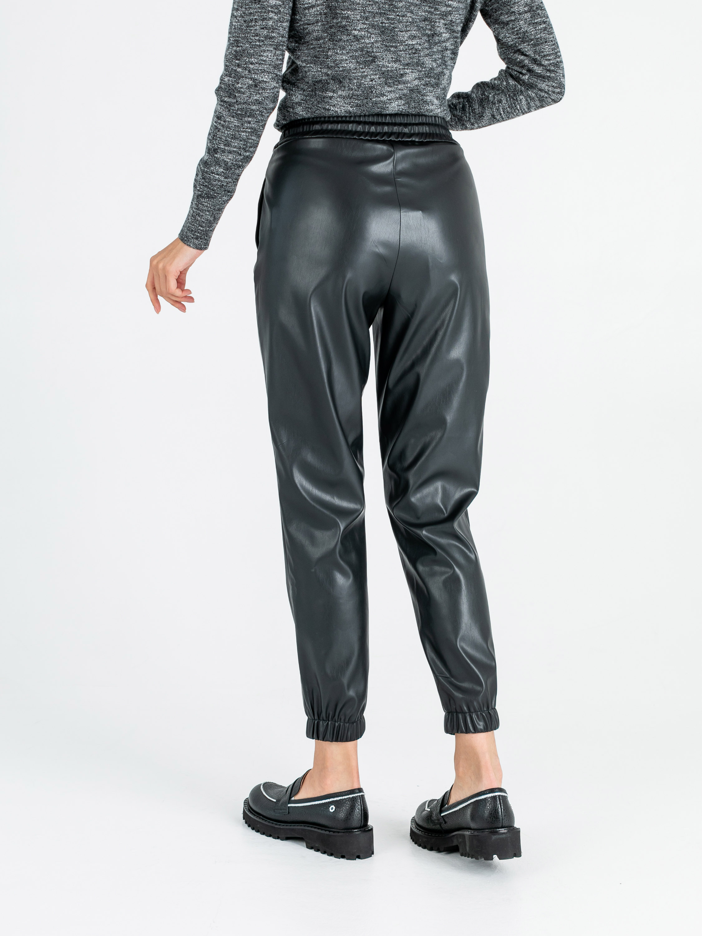 На сайте указаны российские размеры. Брюки-чинос на резинке с регулируемой талией. Впереди 2 больших кармана. Низ брюк оформлен резинкой. Ткань: 55% полиуретан, 40% поливискоза, 5% эластан. Практичный материал, загрязнения с которого легко удаляются влажной салфеткой, что особенно актуально в межсезонье. Крой: брюки свободного прямого силуэта из гладкой искусственной кожи классического черного цвета. Имеют высокую посадку с поясом-резинкой, благодаря чему их легко надевать. Эластичные манжеты в нижней части брюк плотно прилегают к телу – оценить эти достоинства смогут те, кто будет носить их в холодное время года. Удобные функциональные карманы по бокам поместят в себя то, что всегда нужно держать под рукой – телефон, карту и ключи от машины. Отделка: регулировать размер пояса можно при помощи тонкого шнура. Параметры модели: размер 39-42 (86-61-91) Рост 177 см