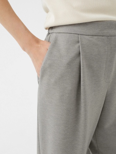 На сайте указаны российские размеры. Брюки со стрелками из мягкого трикотажного полотна прямого свободного силуэта на притачном поясе с боковыми рабочими карманами. Застёжка спереди на молнию и крючок. Сзади на поясе вставлена резинка для более комфортной посадки. По низу изделия манжеты с резинкой. Рост модели на фото - 175 см.