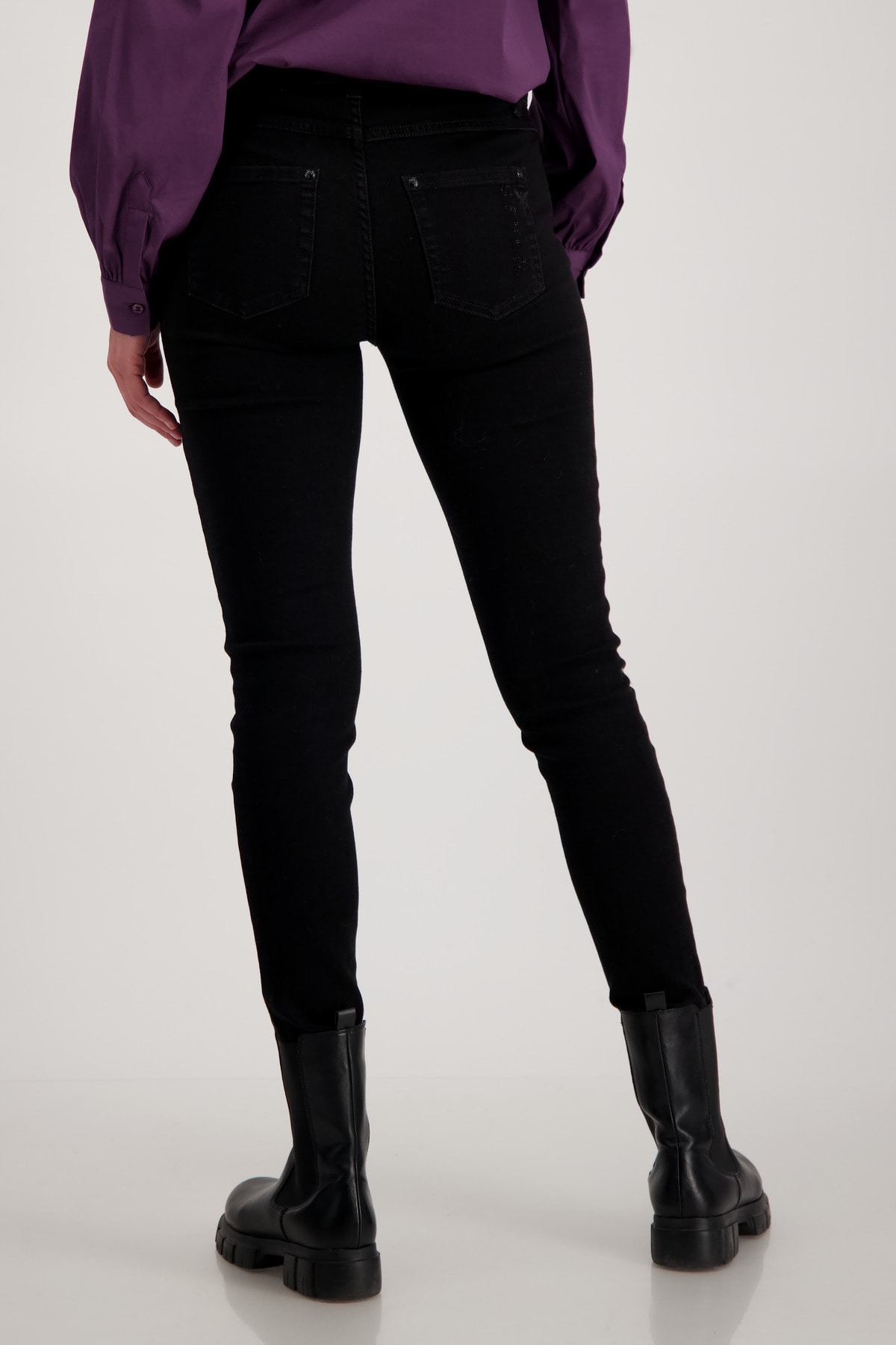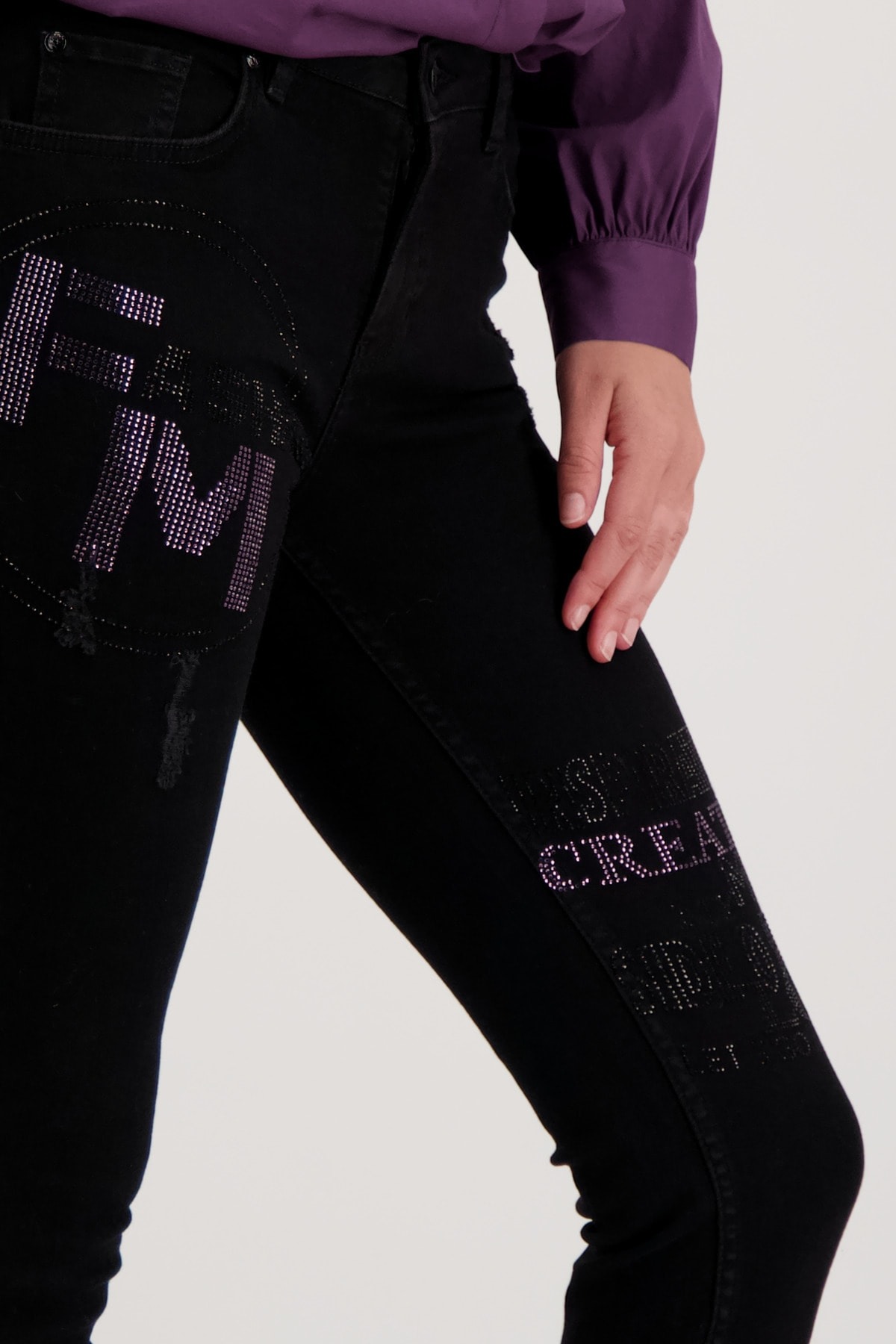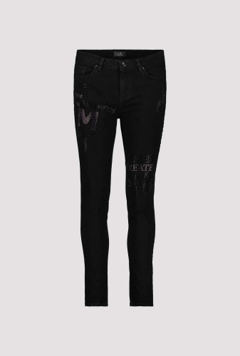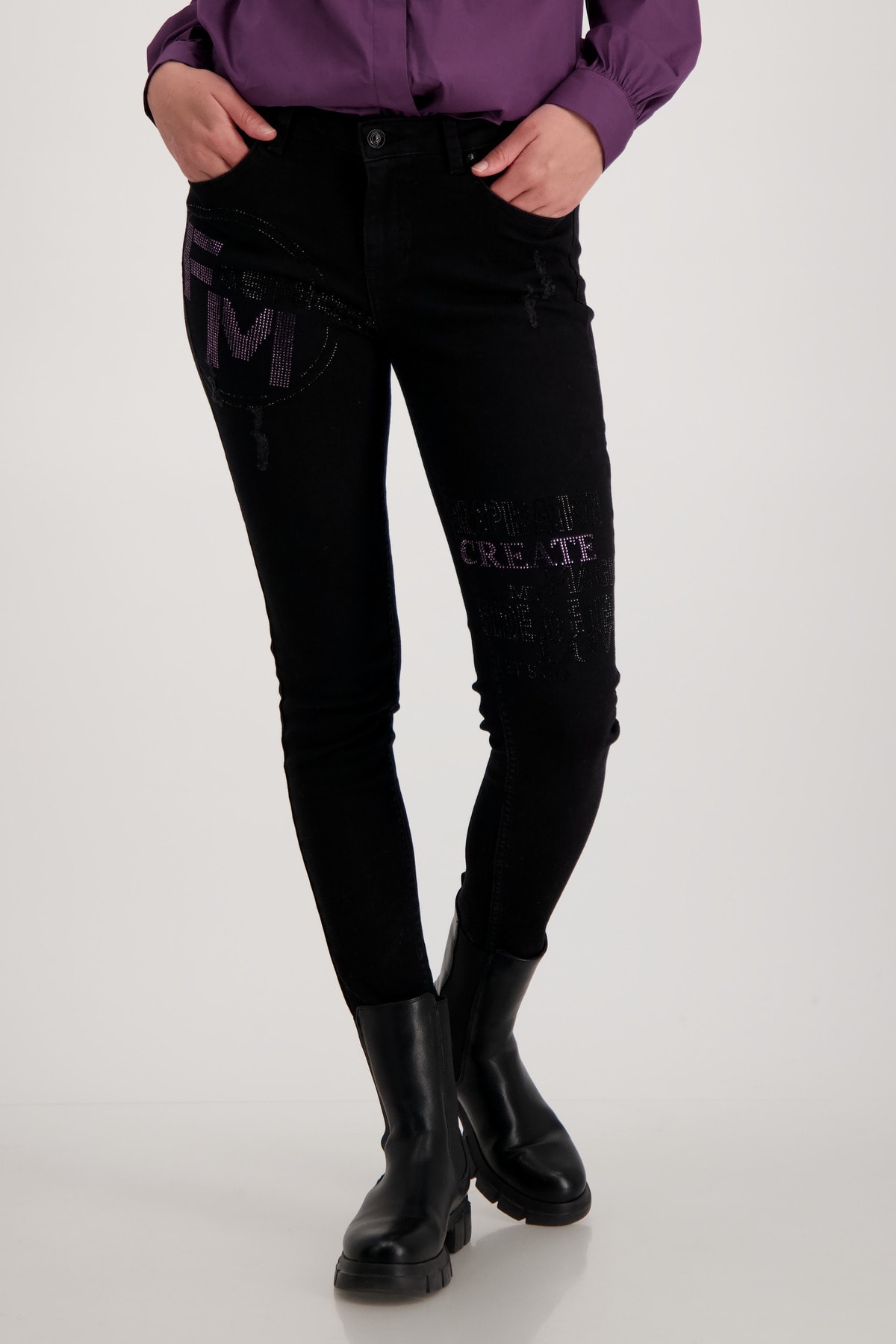 На сайте указаны российские размеры. Облегающие джинсы от monari. Модель со стандартной посадкой имеет классический 5-карманный фасон, пояс со шлевками для ремня и пуговицу на потайной застежке-молнии. Приятная степень эластичности также обеспечивает уникальный комфорт при ношении и делает узкие брюки с деталями из сверкающих стразов в верхней части спереди и сзади абсолютной изюминкой в вашем гардеробе. Надпись со стразами на заднем кармане из горного хрусталя и эмблема из горного хрусталя спереди. Рост модели 179 см.