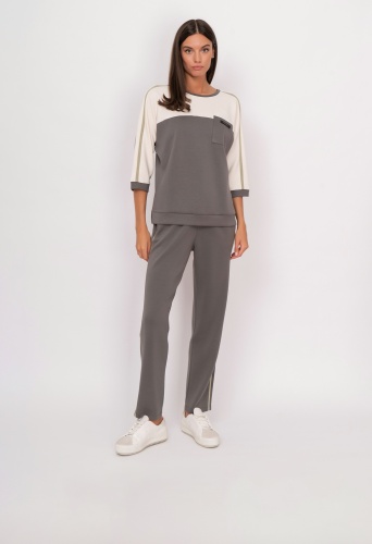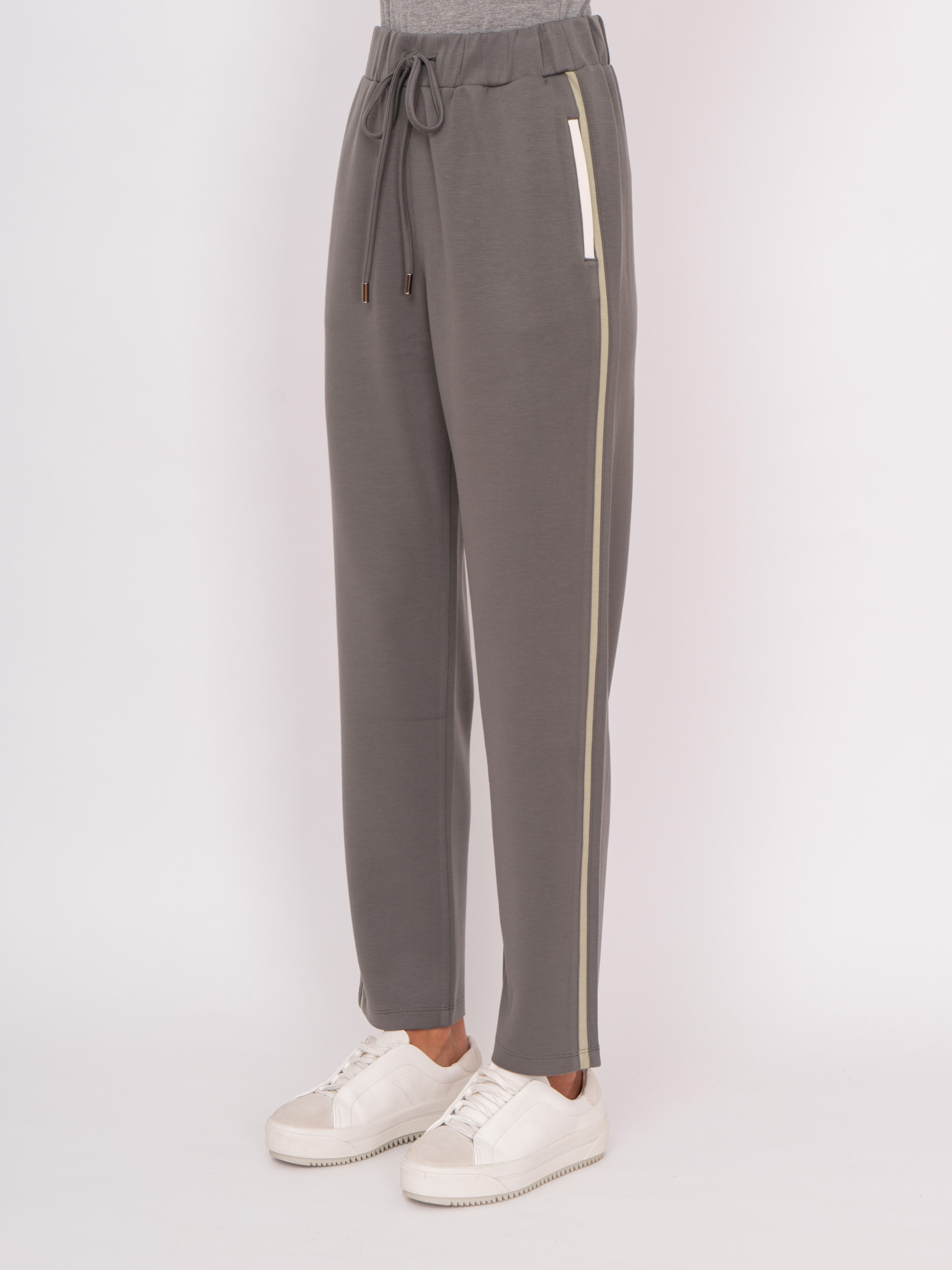 На сайте указаны российские размеры. Зауженные трикотажные спортивные брюки на резинке с завязками, с прорезными карманами, с белыми и зелеными полосками. Рост модели: 175 см Длина брюк: 71 см