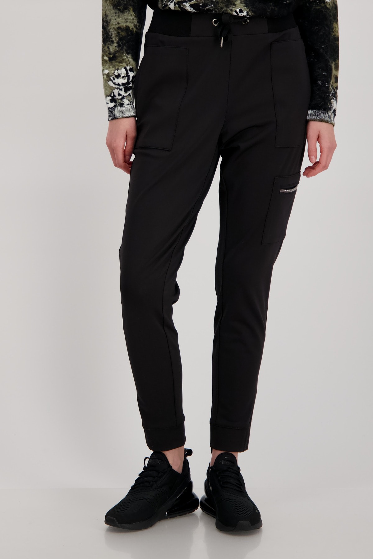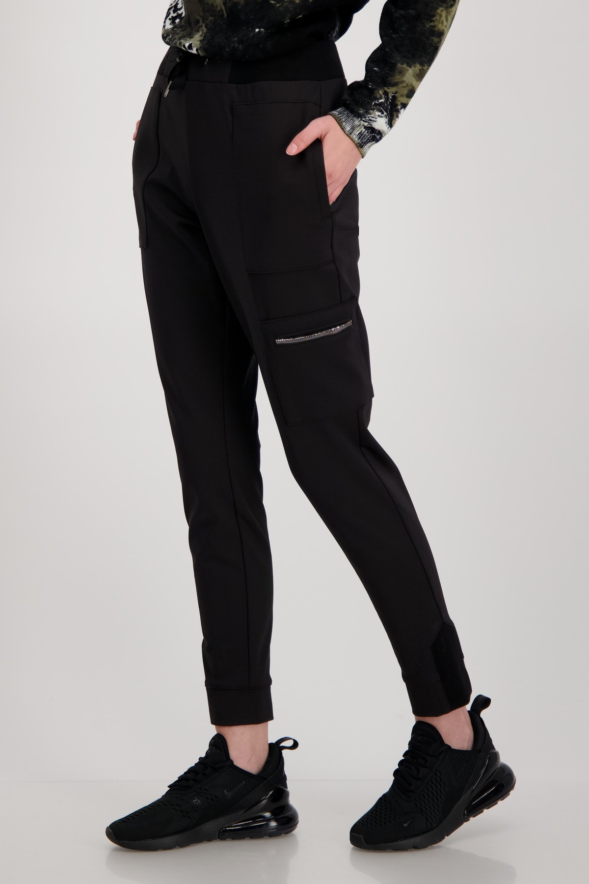 На сайте указаны российские размеры. Эластичные джоггеры-карго от monari, струящегося качественного полиамида эластичного, свободного кроя узкого кроя с нормальной посадкой, поясом с завязкой, пуговицей и потайной застежкой-молнией, а также штанинами с манжетами. Крепится к колену сбоку: классическая сумка-карго на молнии. Прорезные карманы на молнии спереди и ложные прорезные карманы сзади завершают дизайн брюк черного цвета. Рост модели: Рост модели 178 см. Длина по внутреннему шву: 72 см.