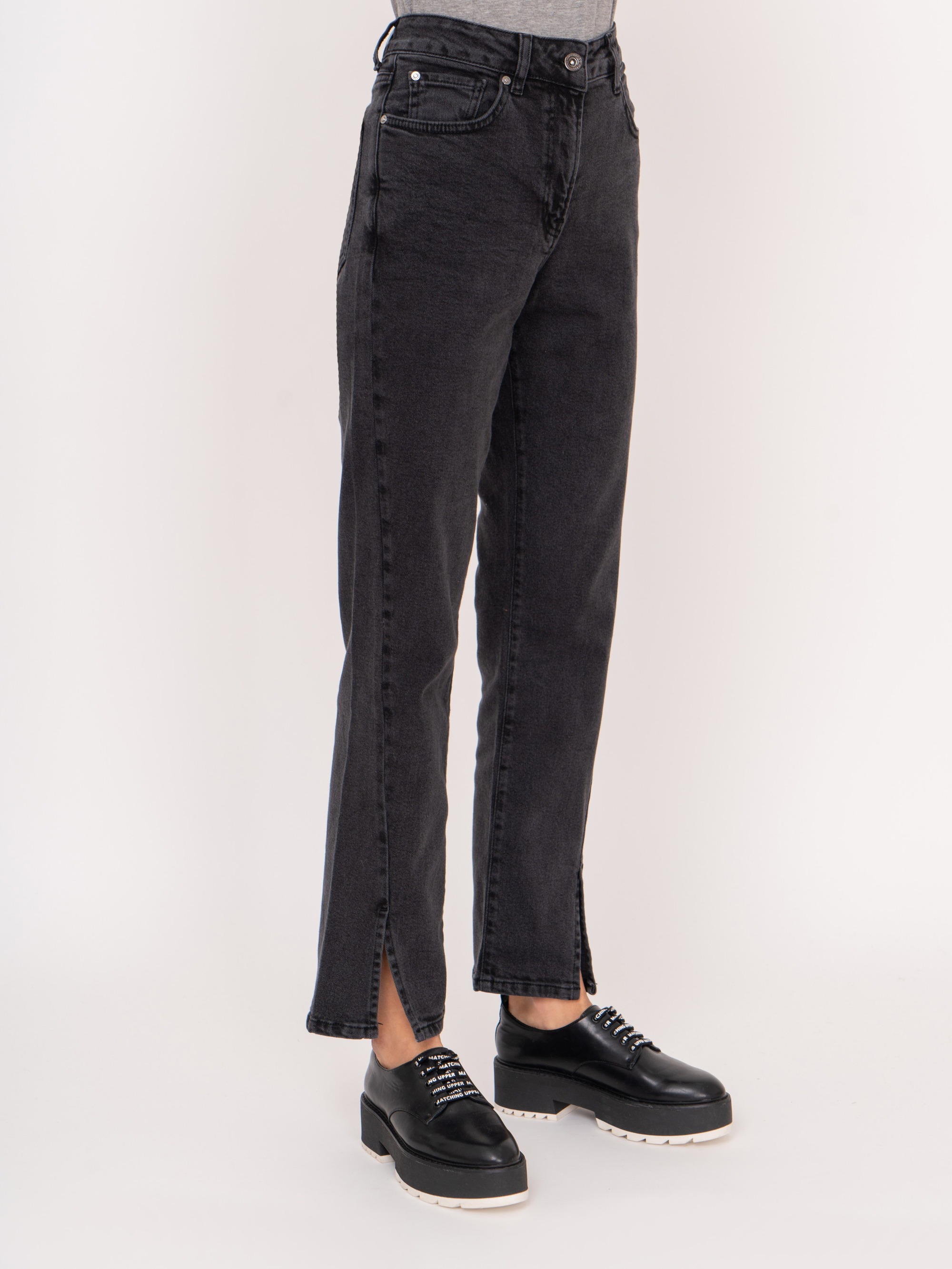 На сайте указаны российские размеры. Темно-серые джинсовые брюки клеш из плотного денима на молнии, с косыми и накладными карманами, с передними разрезами. Рост модели: 175 см Длина брюк: 77 см