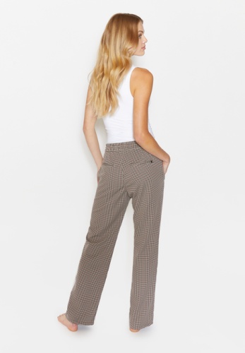 На сайте указаны российские размеры. Современные свободные брюки с модными декоративными швами. Легкая в уходе смесь материалов. Сплошной узор в клетку. Брюки удлиненные на шнурке.