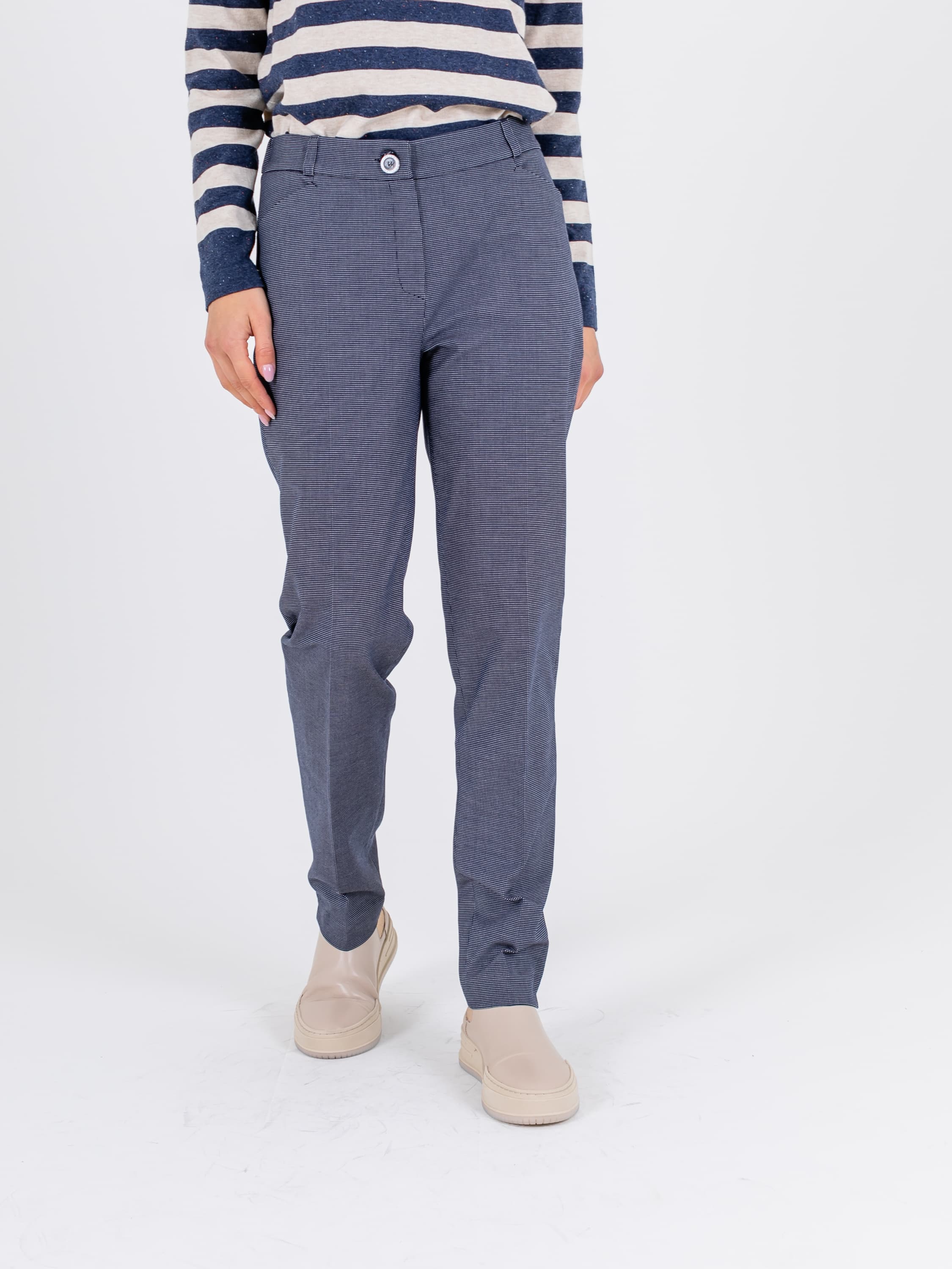 На сайте указаны российские размеры. Ткань: гладкая костюмная ткань в клетку (32% вискоза, 62% полиэстер, 6% эластан) Крой: брюки прямого силуэта с высокой линией талии. Имеют стрелку, которая создает дополнительную вертикаль и делает образ законченным. Модель выделяется оригинальными горизонтальными квадратными карманами, не уступающими по функциональности стандартным. Застегиваются на молнию и пуговицу. Отделка: в задней части на поясе создается легкая сборка. Разрезы в области щиколоток добавляют комфорта при движении. Рост модели: 175 см.