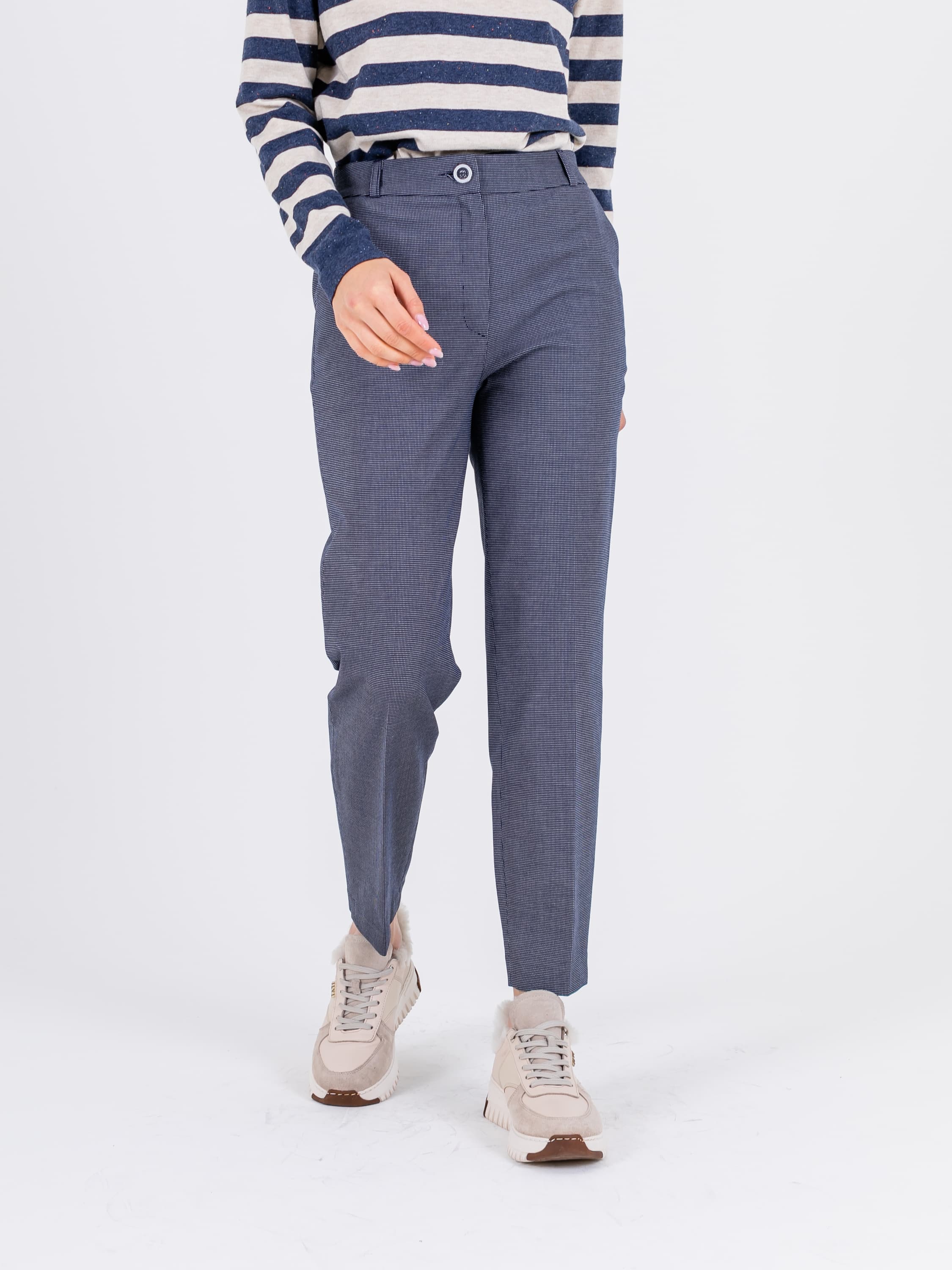 На сайте указаны российские размеры. Ткань: гладкая костюмная ткань в клетку (32% вискоза, 62% полиэстер, 6% эластан) Крой: брюки прямого силуэта с высокой линией талии, которая подчеркивает достоинства фигуры. Имеют стрелку, создающую дополнительную вертикаль и делающую образ законченным. Два функциональных кармана можно использовать для хранения важных вещей, которые не хочется держать в руках. Застегиваются на молнию и пуговицу. Отделка: в модели предусмотрены шлевки, в которые можно вдеть тонкий пояс или платок. Рост модели: 175 см.