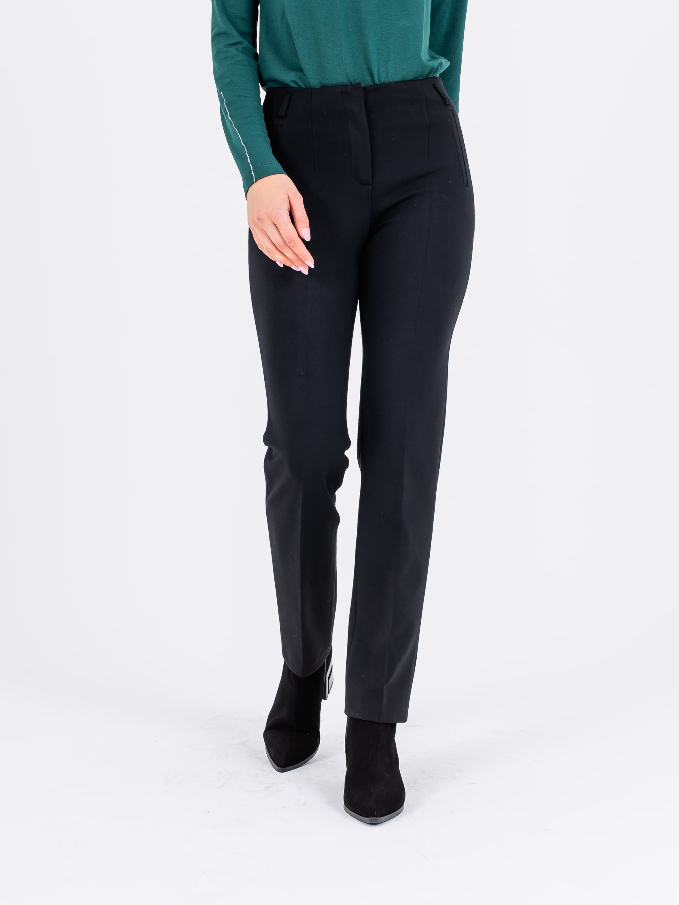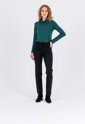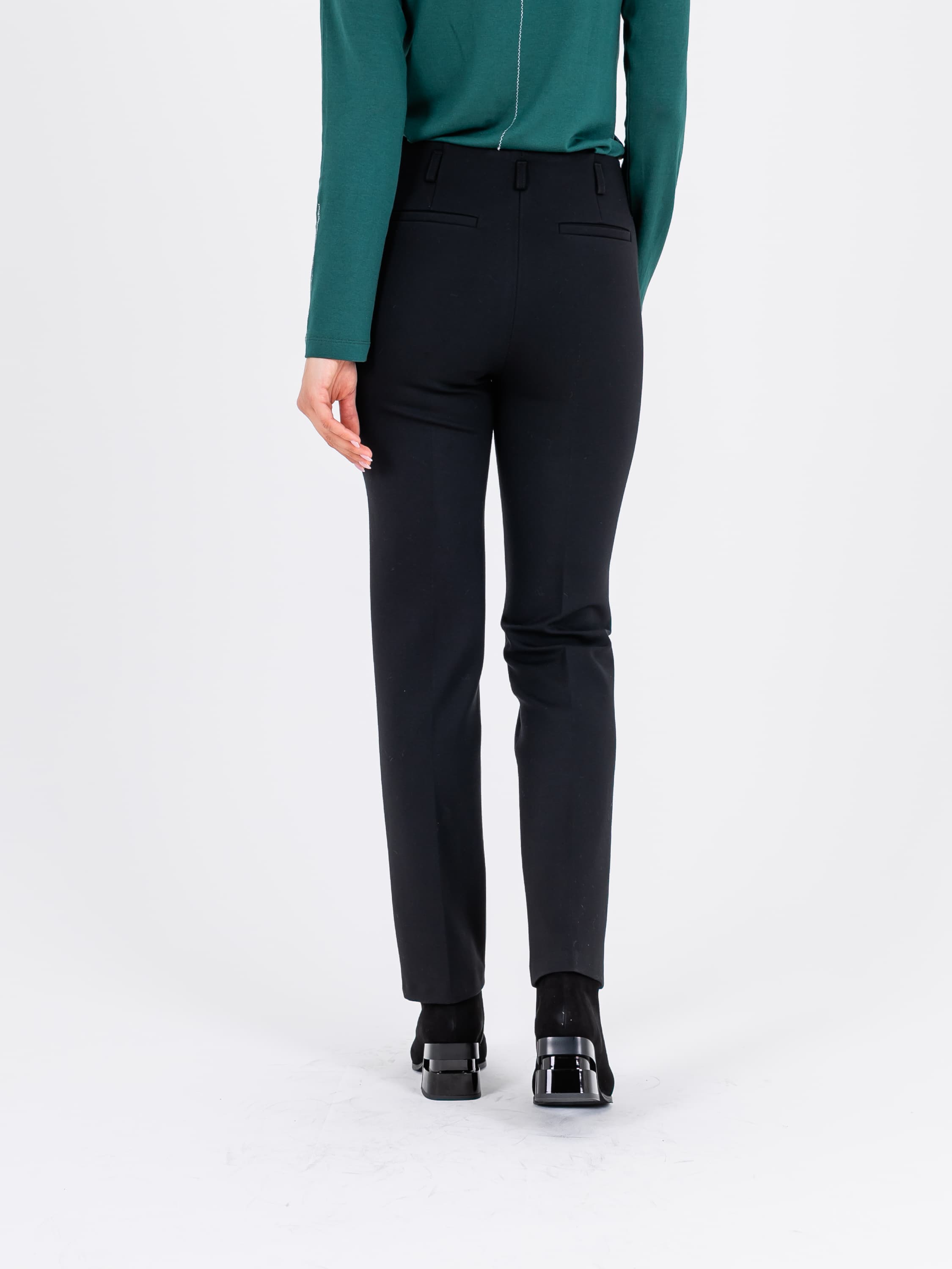 На сайте указаны российские размеры. Классические брюки со стрелками и завышенной талией на скрытой пуговице. По 2 имитированных кармана спереди и сзади. Ткань: костюмная ткань средней плотности (62% нейлон, 35% вискоза, 3% эластан). Не мнется в процессе носки. Крой: неоклассическая модель брюк со средней посадкой, прикрывающей зону живота. Прямой облегающий силуэт подчеркивает достоинства фигуры, а стрелка создает вертикаль, которая визуально корректирует возможные недостатки в области бедер. Брюки имеют стандартную длину, их можно носить с различной обувью – на плоском ходу или на каблуке. Отделка: сдержанная модель, которая не нуждается в дополнительных элементах отделки. Сзади есть два декоративных кармана, а сверху – шлевки для тонкого ремешка или платка. Рост моделм 173 см