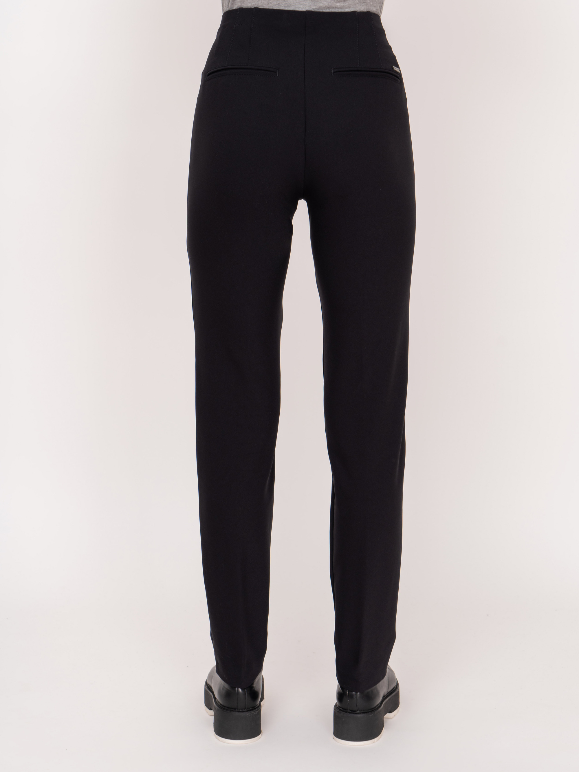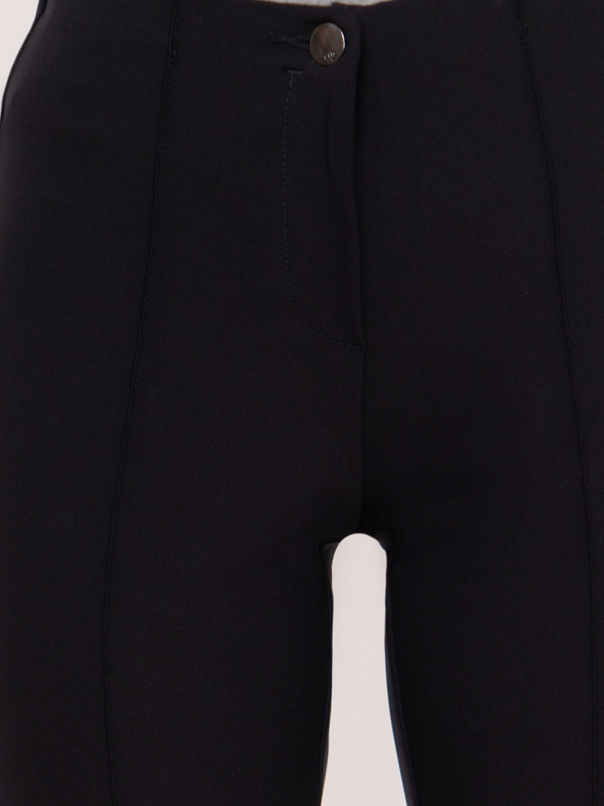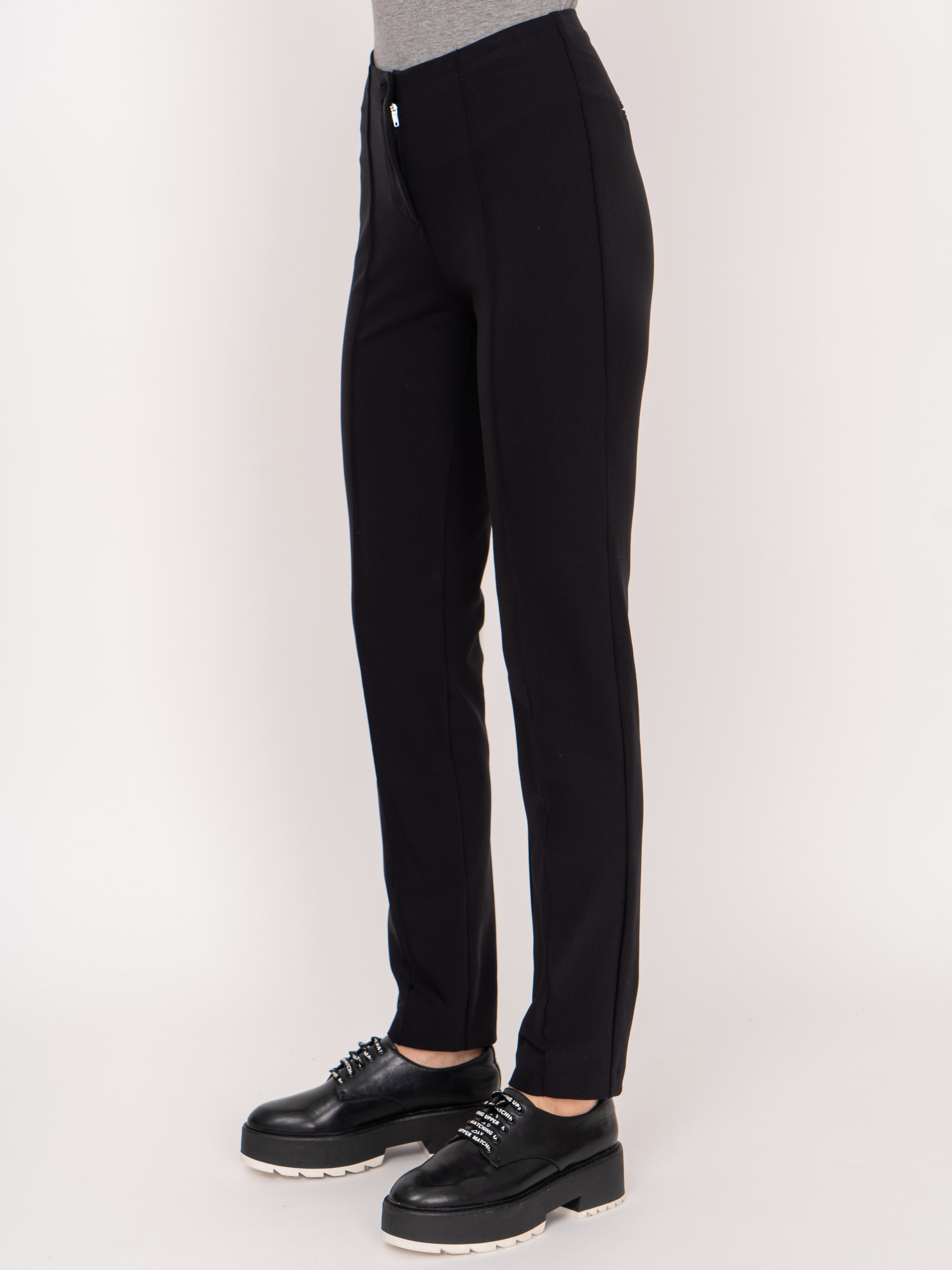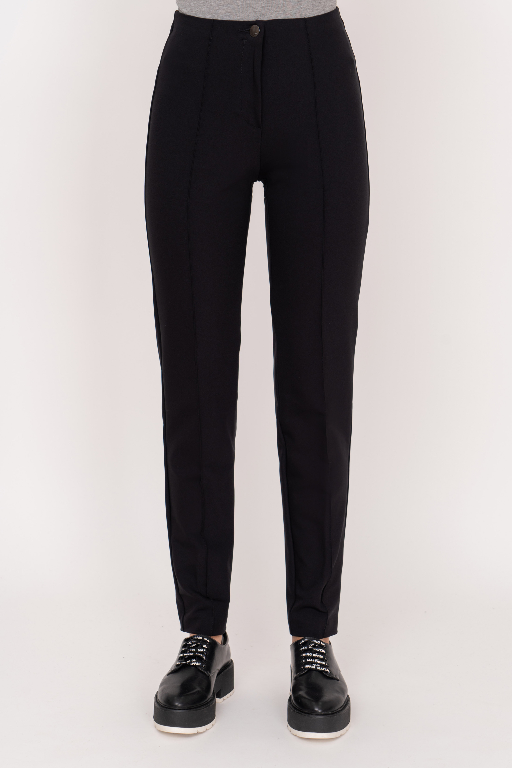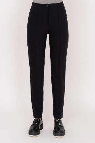 На сайте указаны российские размеры. Зауженные текстильные черные брюки на молнии без карманов, с акцентными швами спереди. Рост модели: 175 см. Длина брюк: 81 см.