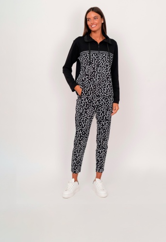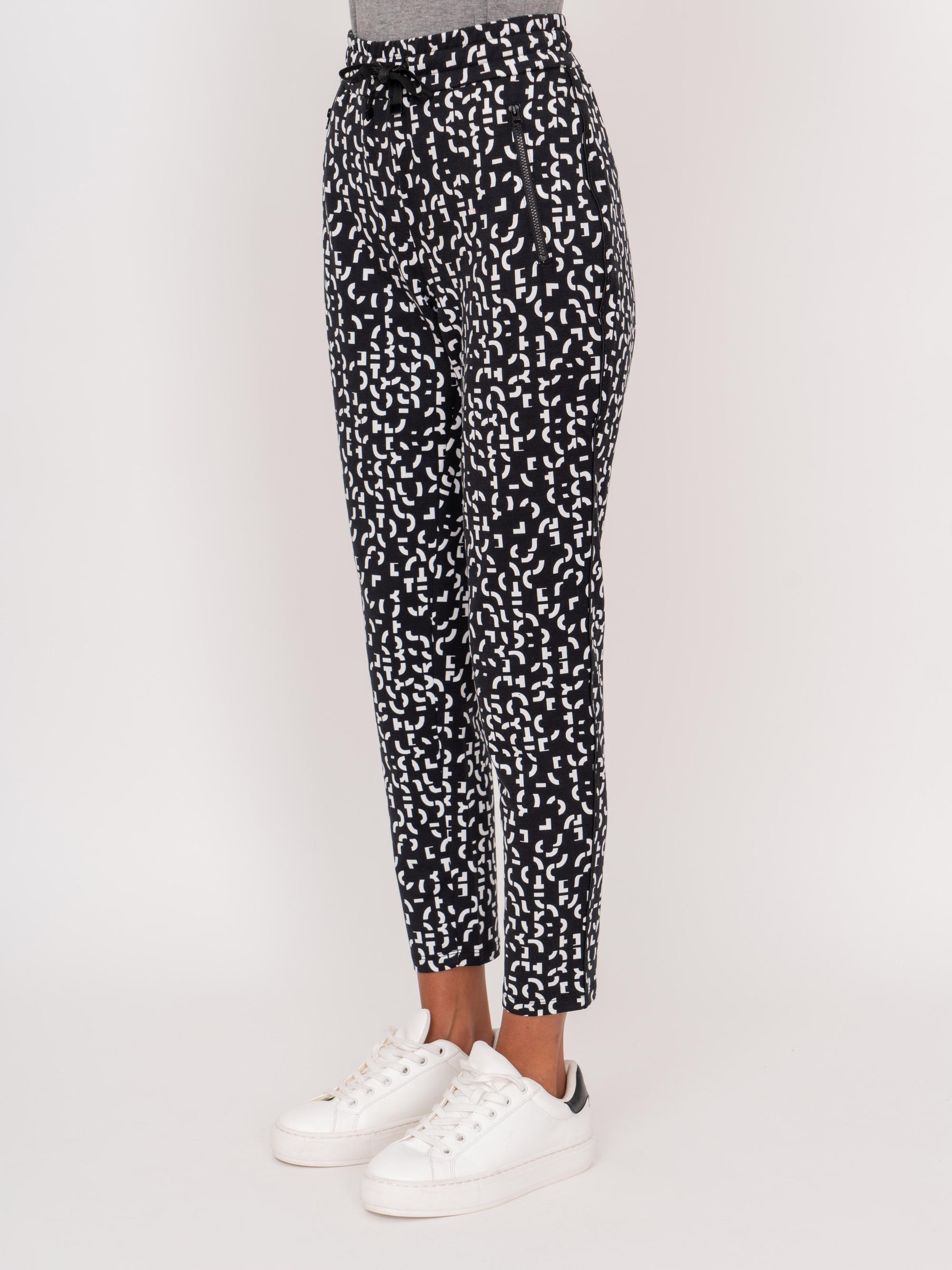На сайте указаны российские размеры. Трикотажные черные зауженные брюки на резинке с завязками, с прорезными карманами на молнии, с белым абстрактным рисунком. Рост модели: 175 см. Длина брюк: 70 см.