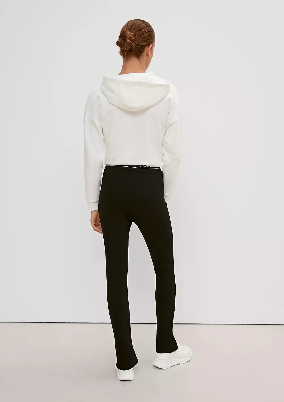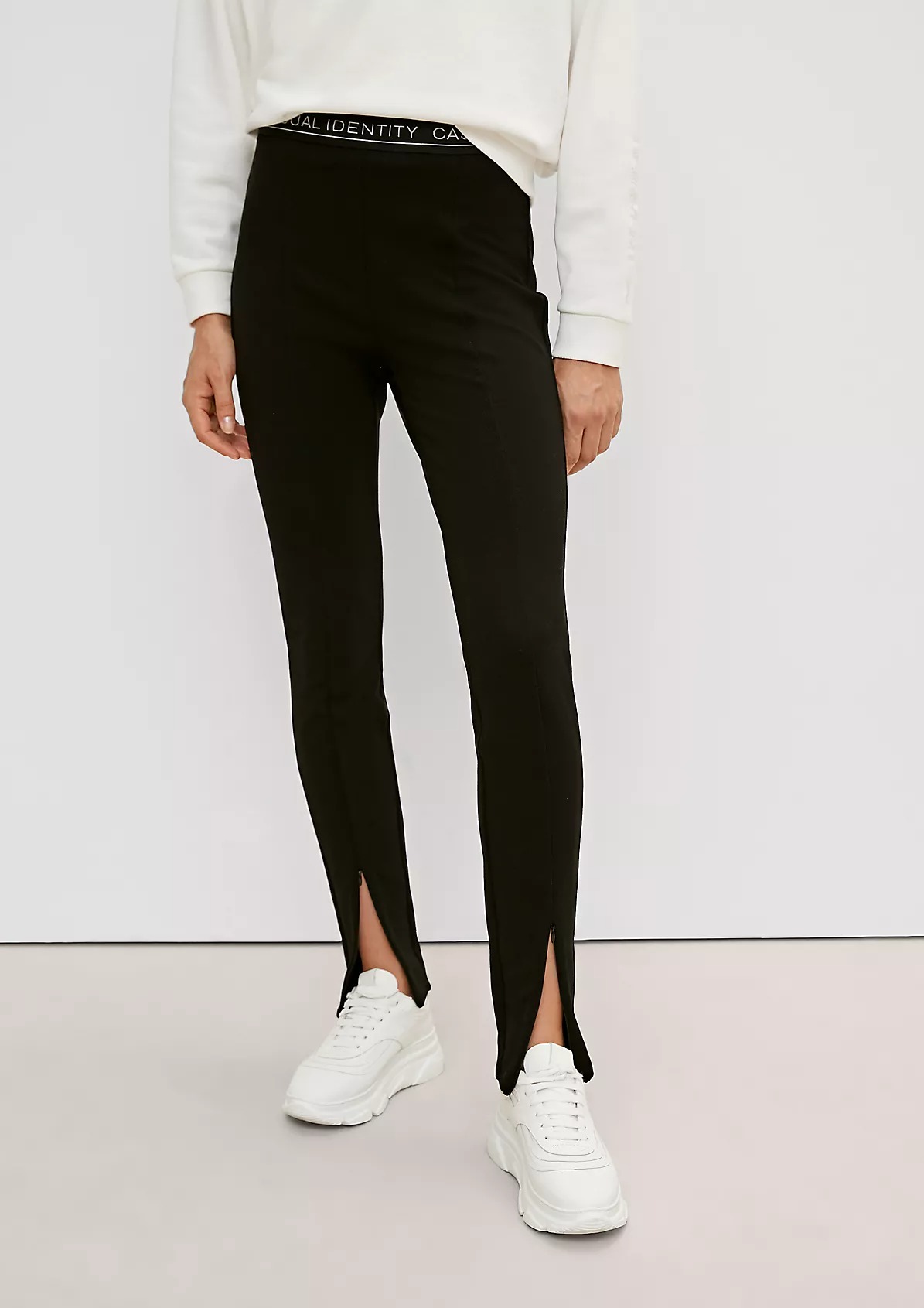 На сайте указаны российские размеры. Спортивные облегающие леггинсы с разрезами спереди. Эластичная резинка-пояс с надписью.