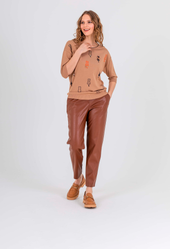 Прямые брюки с завышенной талией длиной до щиколотки с застежкой на молнию и 2 пуговицы. Брюки слегка зауженные книзу. На передних половинках расположены два кармана с отрезным бочком. На задних половинках два прорезных кармана с листочками. Верх брюк обработан поясом на резинке.