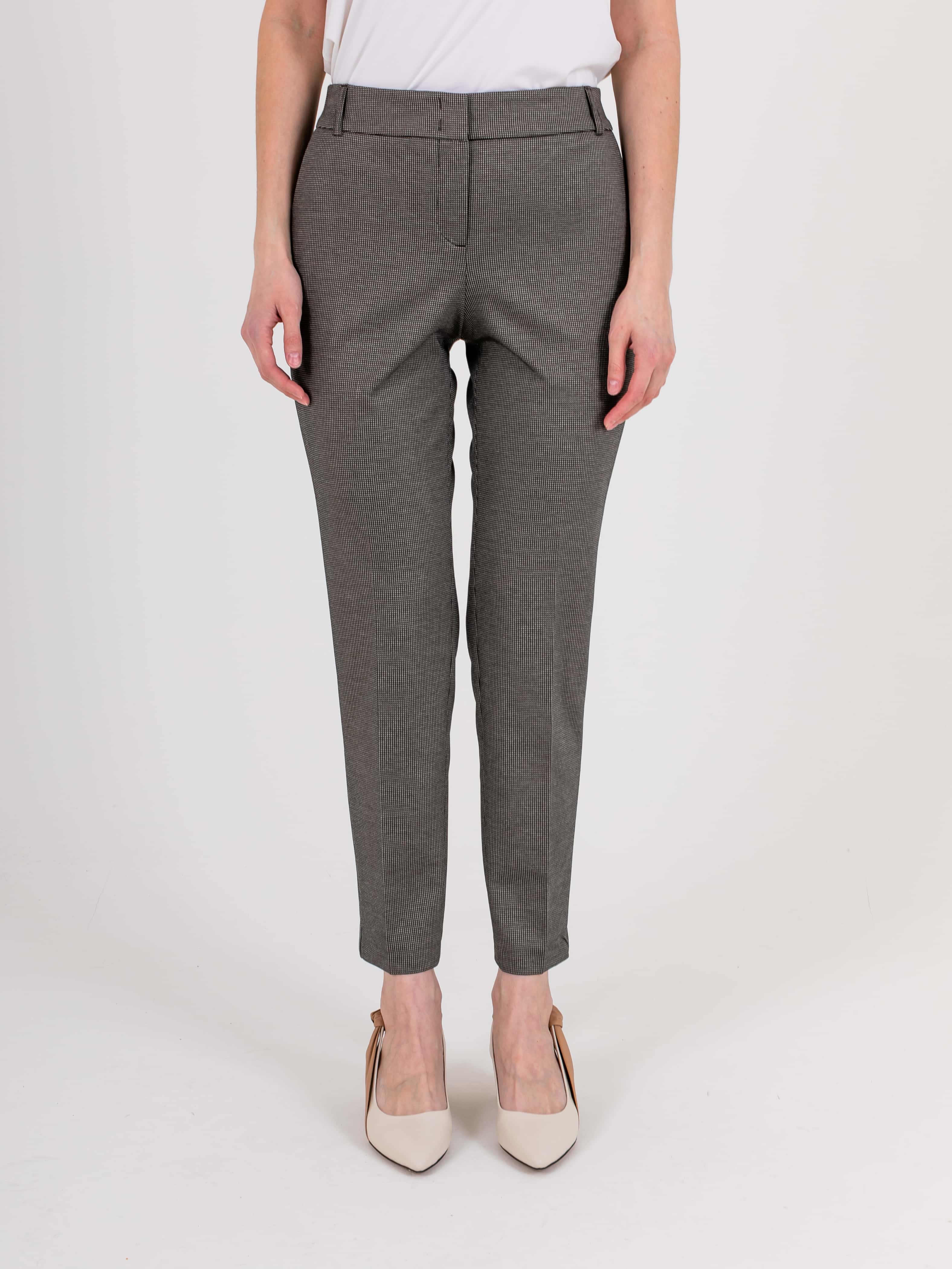 Прямые брюки с завышенной талией длиной до щиколотки с застежкой на молнию и 1 пуговицу, дизайнерская особенность модели – принт «клетка» и лампасы в боковых швах. Брюки слегка зауженные книзу. На передних половинках расположены два кармана с отрезным бочком. На задних половинках два прорезных кармана с листочками. Верх брюк обработан поясом на резинке со шлевками.