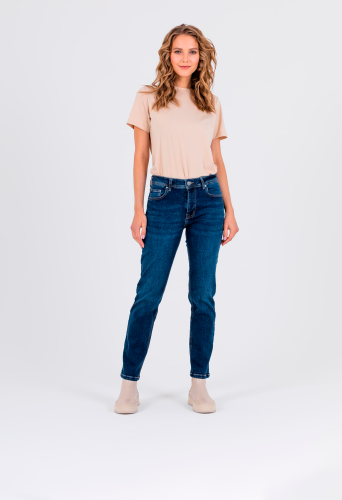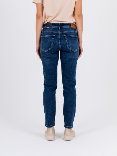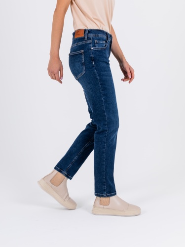 Длинные джинсы «Slim Fit» с застежкой на молнию и 1 пуговицу. Джинсы слегка зауженные книзу, с легким варёным эффектом. На передних половинках расположены два кармана с отрезным бочком и один монетный карман. На задних половинках два накладных кармана и фигурная кокетка. Верх брюк обработан поясом со шлевками.