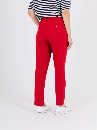 На сайте указаны российские размеры. Прямые брюки с завышенной талией длиной до щиколотки с застежкой на молнию и 1 пуговицу. Брюки слегка зауженные книзу. На передних половинках расположены два кармана с отрезным бочком и листочкой. На правой задней половинке прорезной карман с листочкой, прорезной петлей и пуговицей, для фиксации кармана. Верх брюк обработан поясом со шлевками.