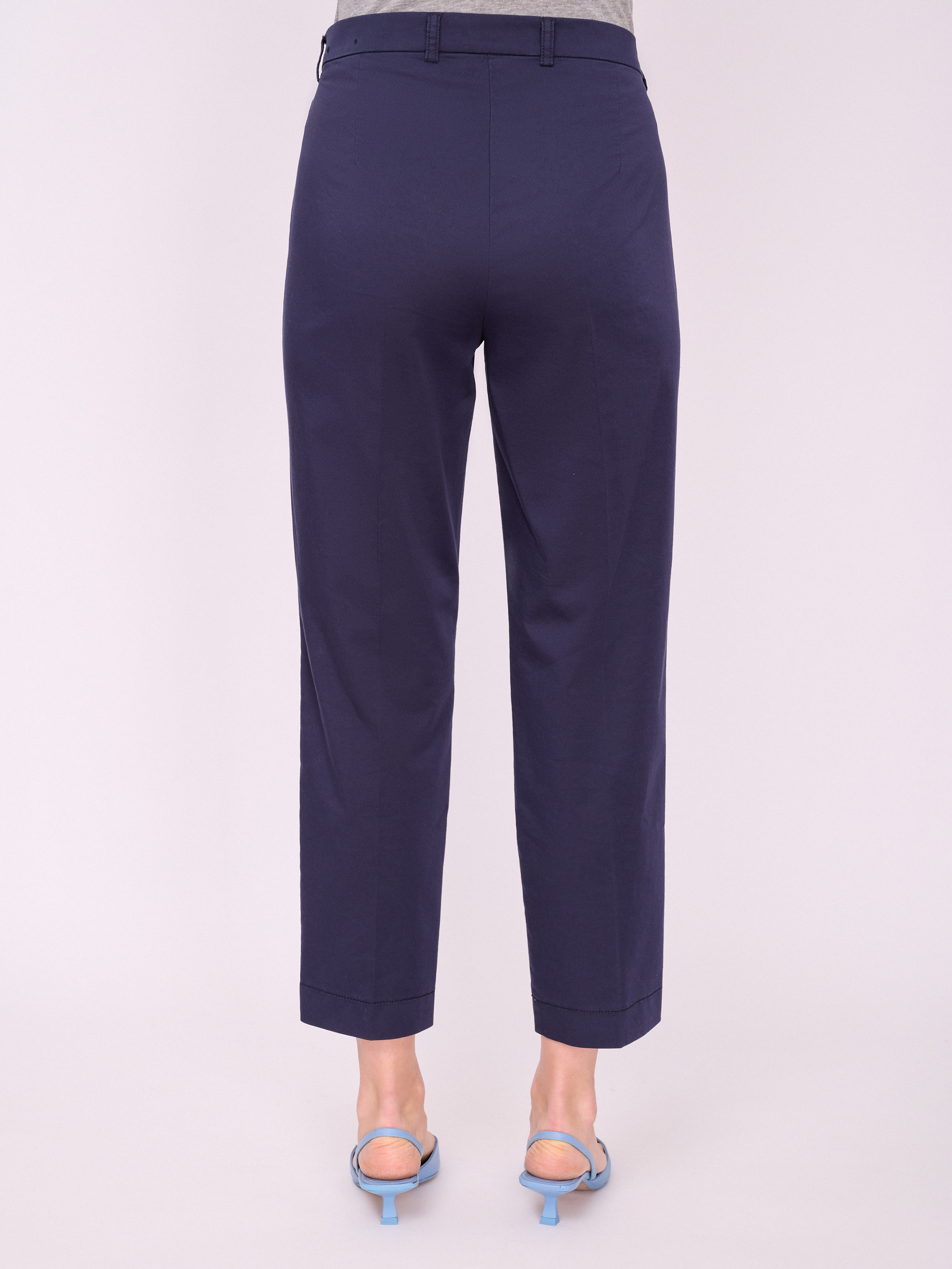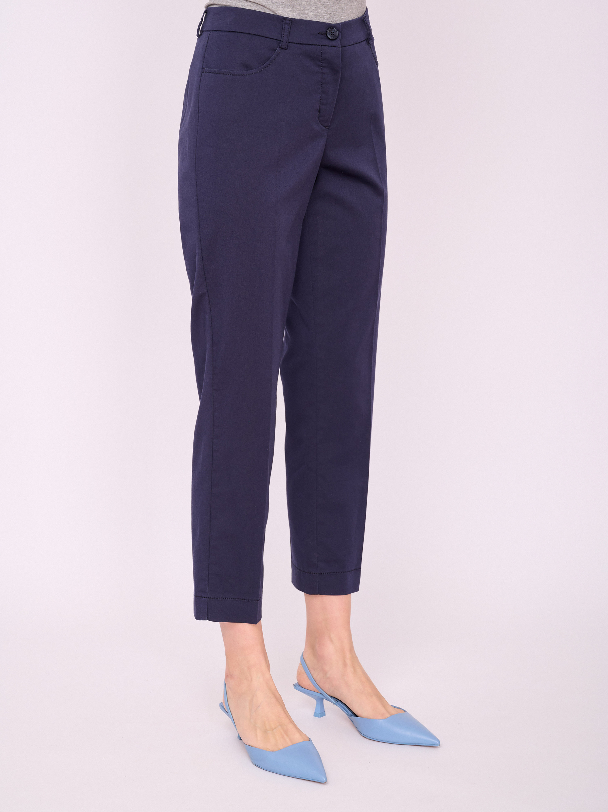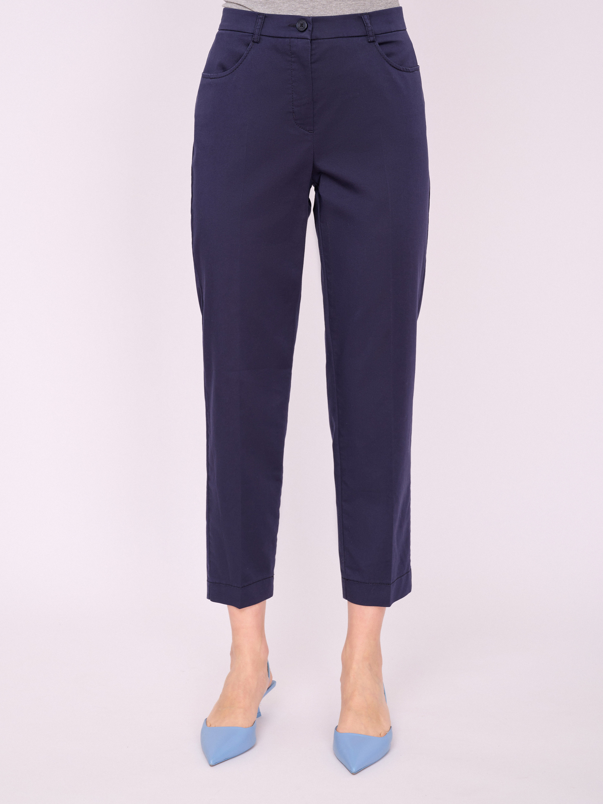 На сайте указаны российские размеры. Зауженные укороченные брюки на молнии, со стрелками и карманами с отрезным бочком. Длина брючин: 68 см. Рост модели 175 см.
