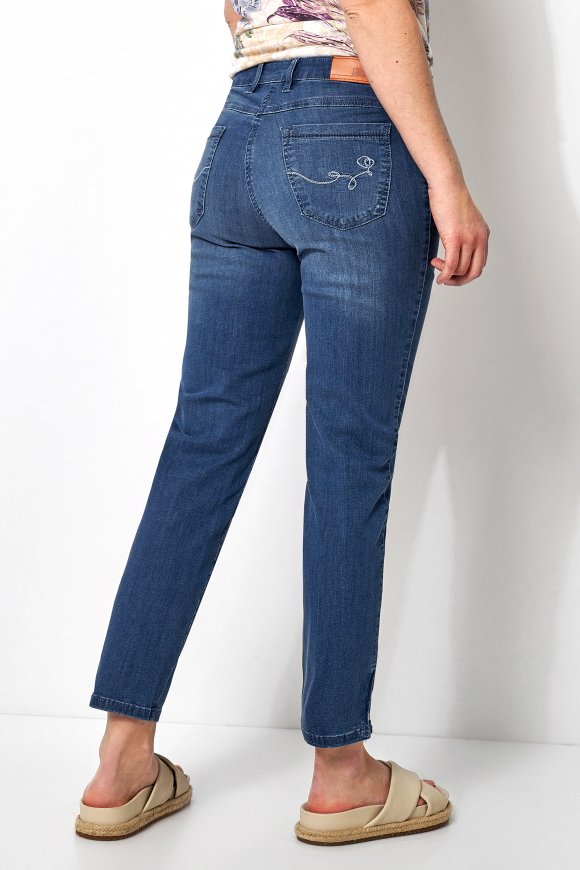 На сайте указаны российские размеры. Укороченные джинсы из летнего денима с эффектом шейпинга, тонкой вышивкой на задних карманах брюк и молниями по подолу. Низкая посадка. Рост модели 172 см.
