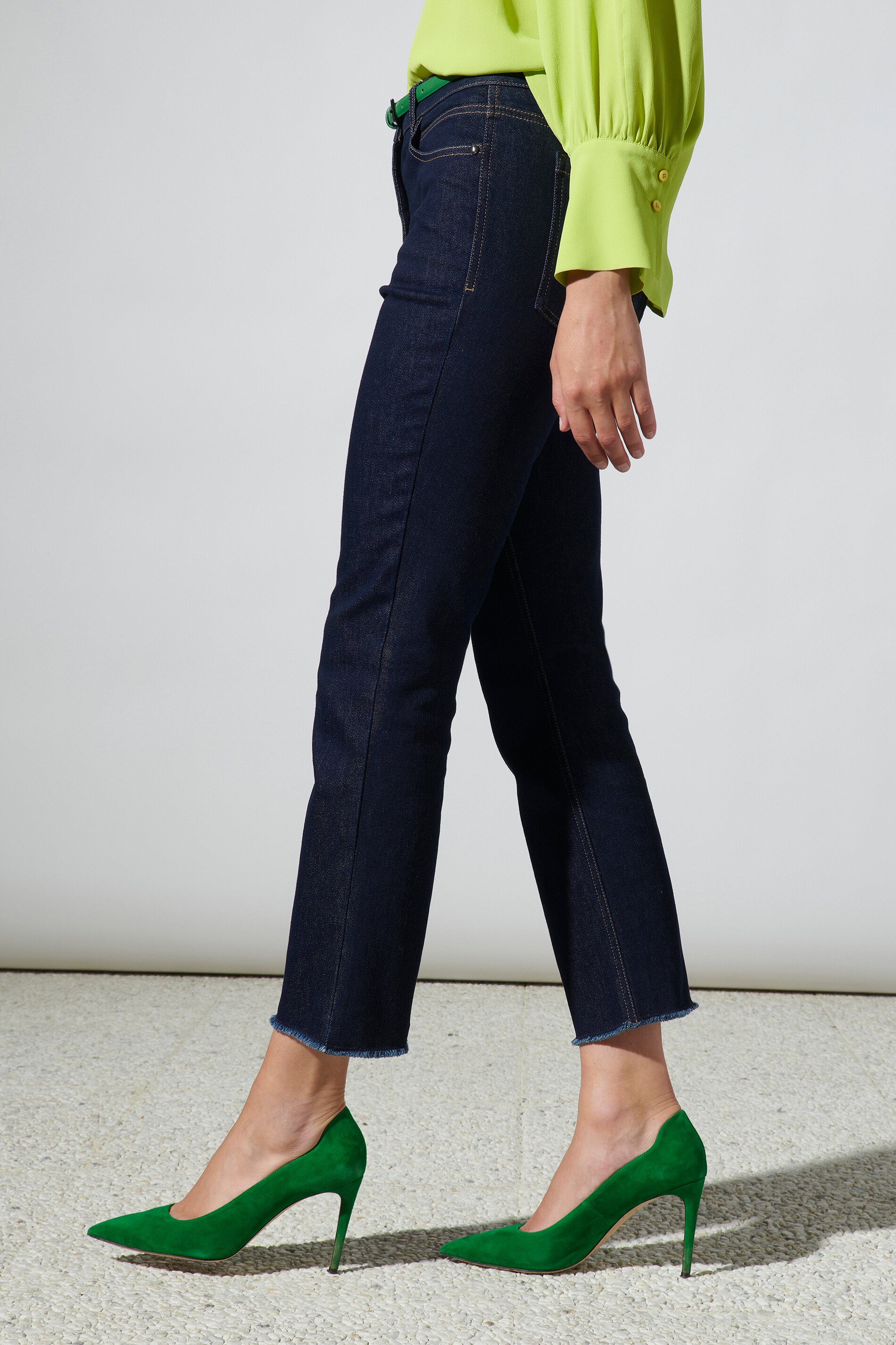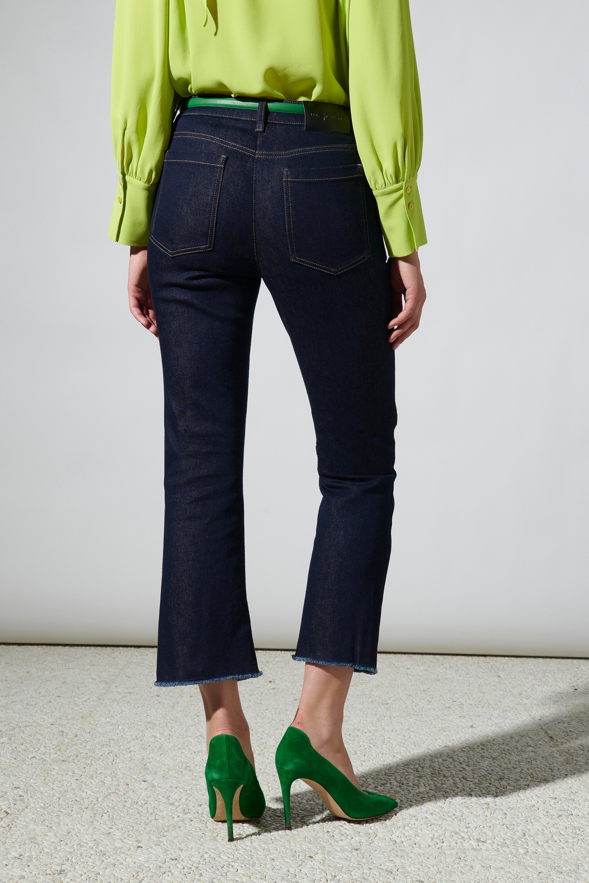На сайте указаны российские размеры. Укороченные джинсы из аутентичного высокоэластичного денима с расклешенным силуэтом. Элегантные брюки с эффектом потертости, классическим дизайном с пятью карманами и открытой кромкой. Рост модели 178 см