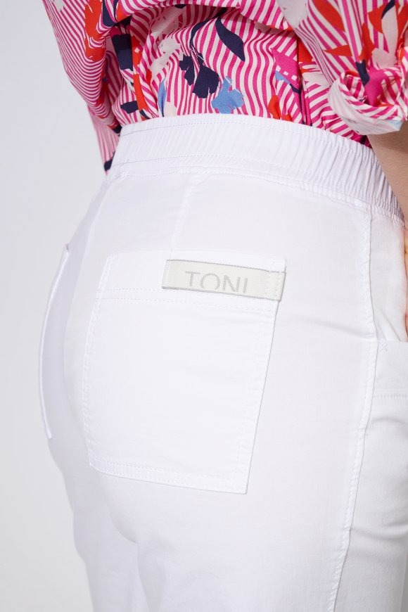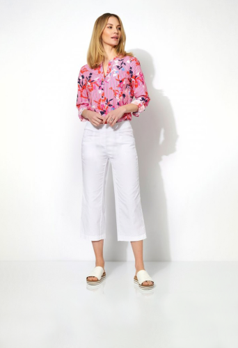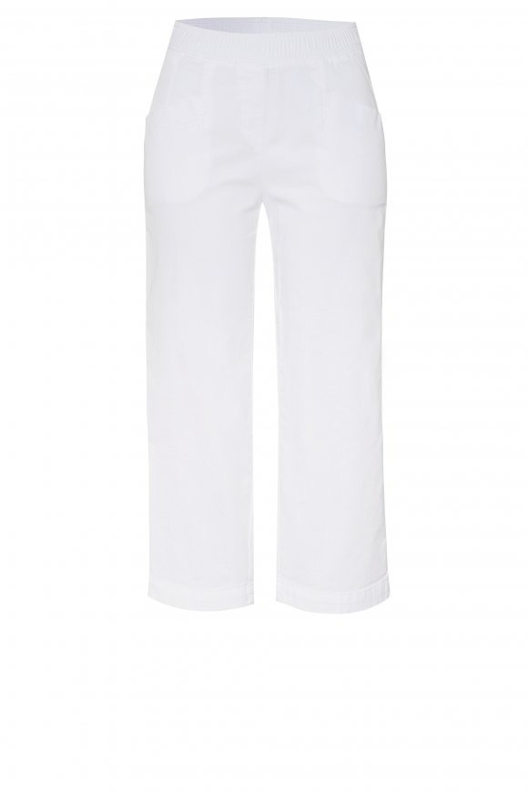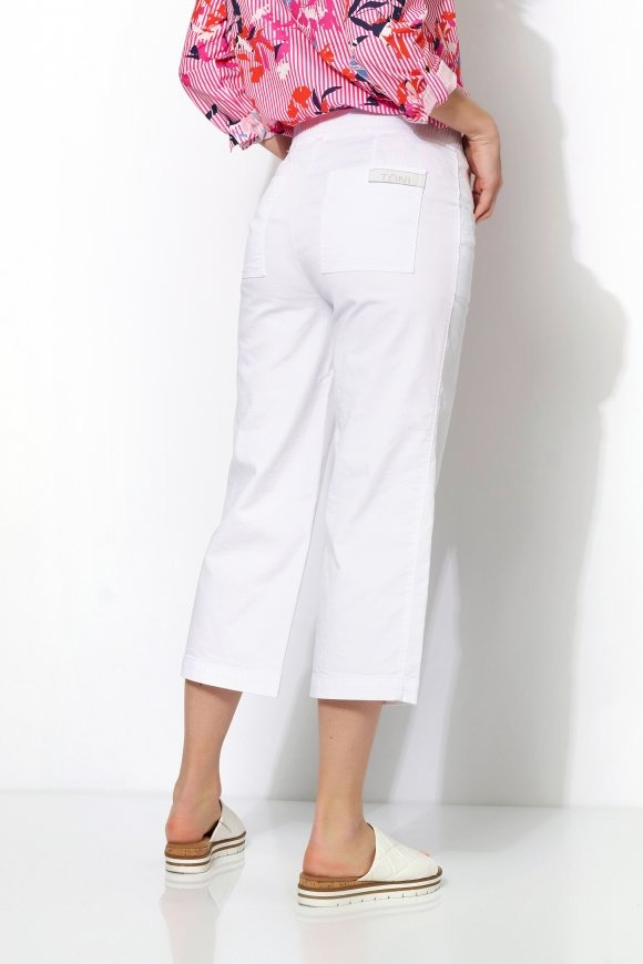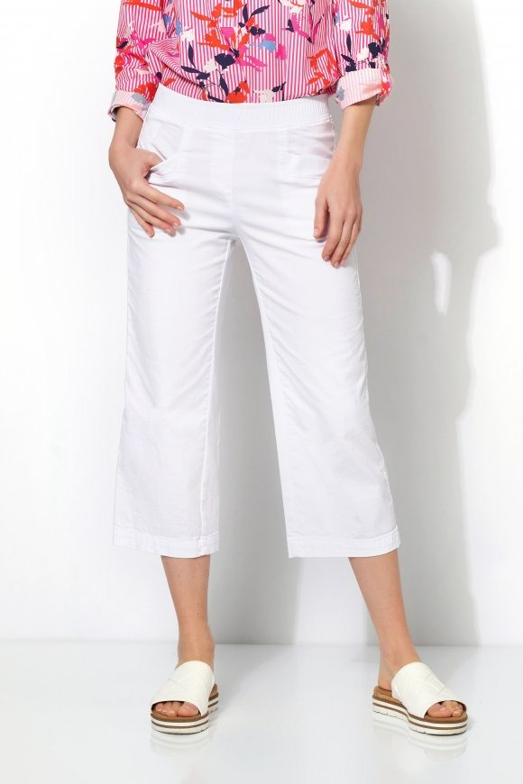 На сайте указаны российские размеры. Летние брюки из легкого смесового хлопка, с эластичным поясом, расклешенными штанинами и воздушной длиной 3/4. Длина по внутреннему шву: 60 см. Рост модели 178 см.