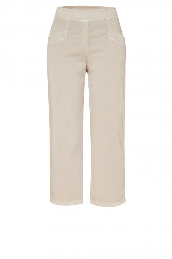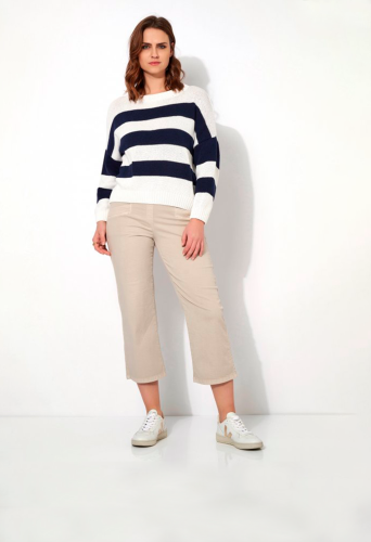 На сайте указаны российские размеры. Летние брюки из легкого смесового хлопка, с эластичным поясом, расклешенными штанинами и воздушной длиной 3/4. Длина по внутреннему шву: 60 см. Рост модели 178 см.