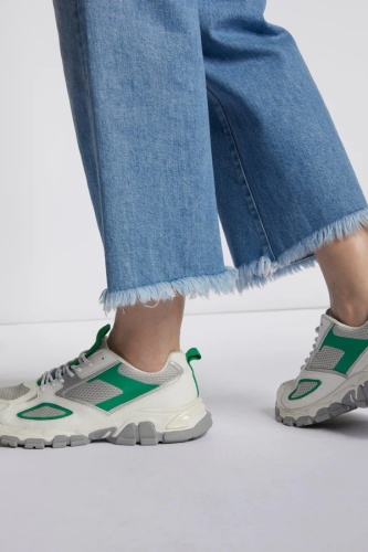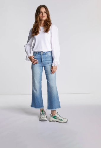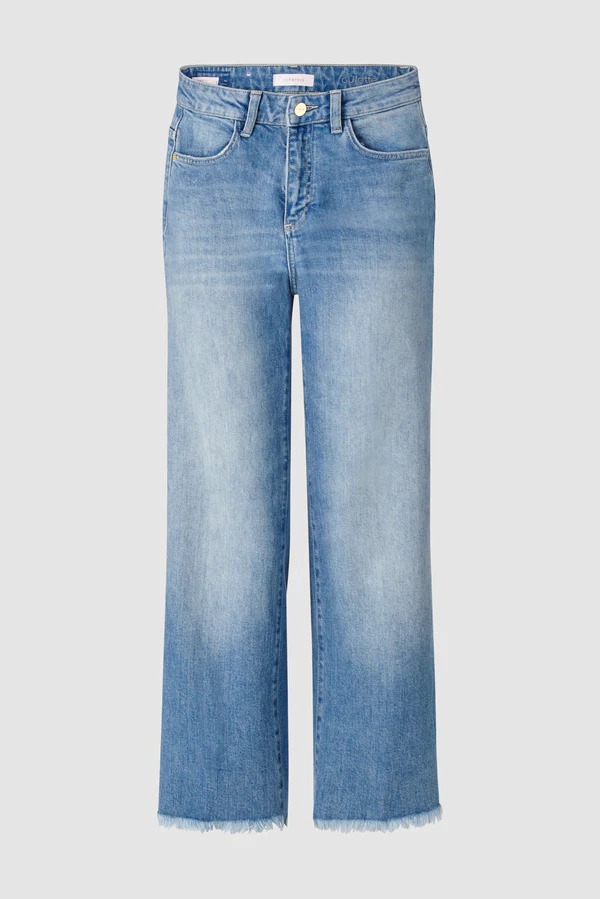 На сайте указаны российские размеры. Брюки-кюлоты из синего денима с высокой посадкой прямо в тренде. Тем более, что ее широкая нога красуется в укороченном стиле с бахромой. Классические детали: застежка на молнию и четыре кармана. Джинсы также отличаются экологичностью. Длина в размере 42: 67 см. Рост модели 177 см.