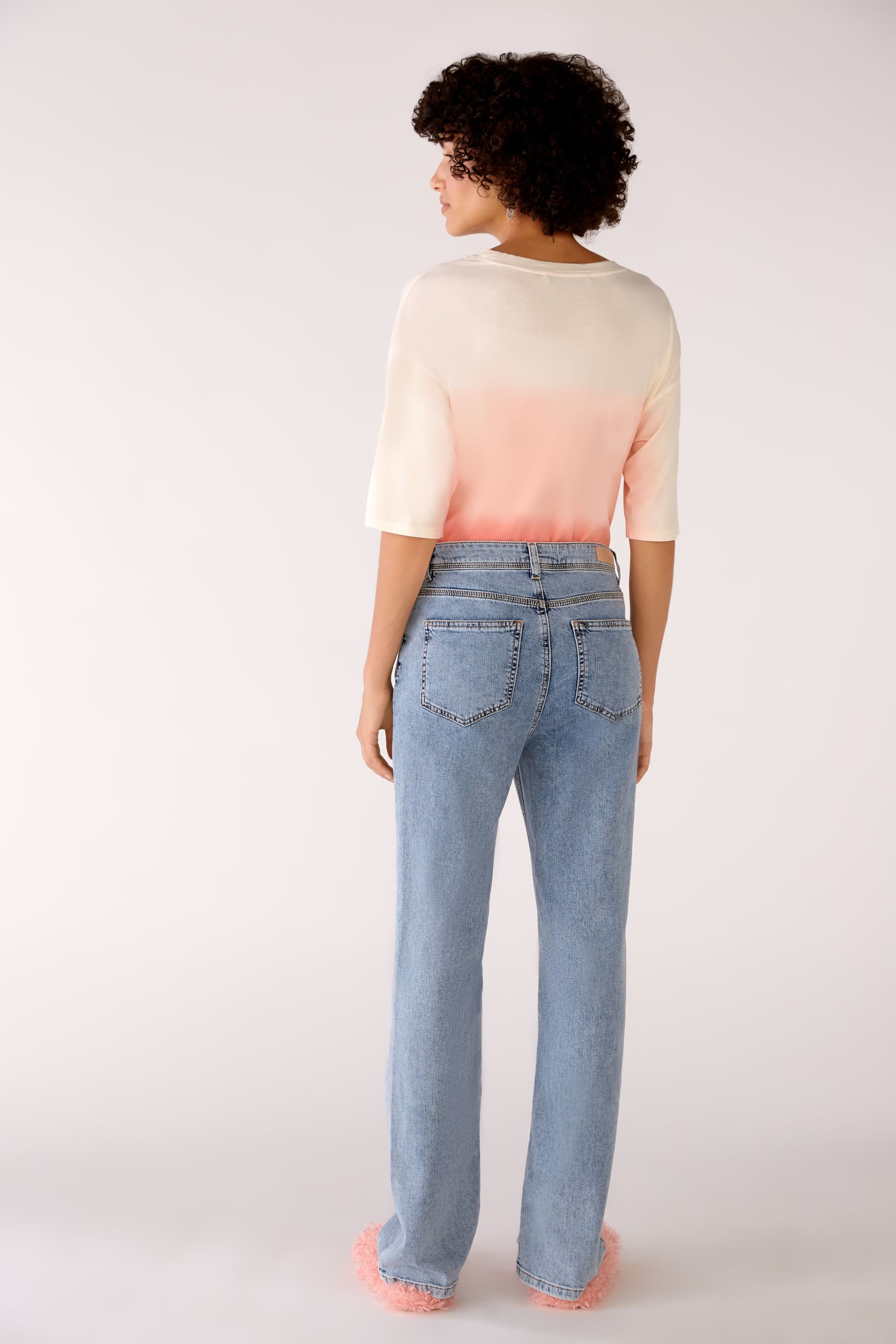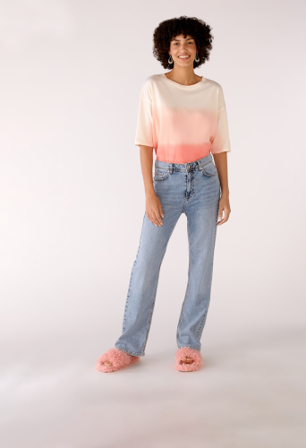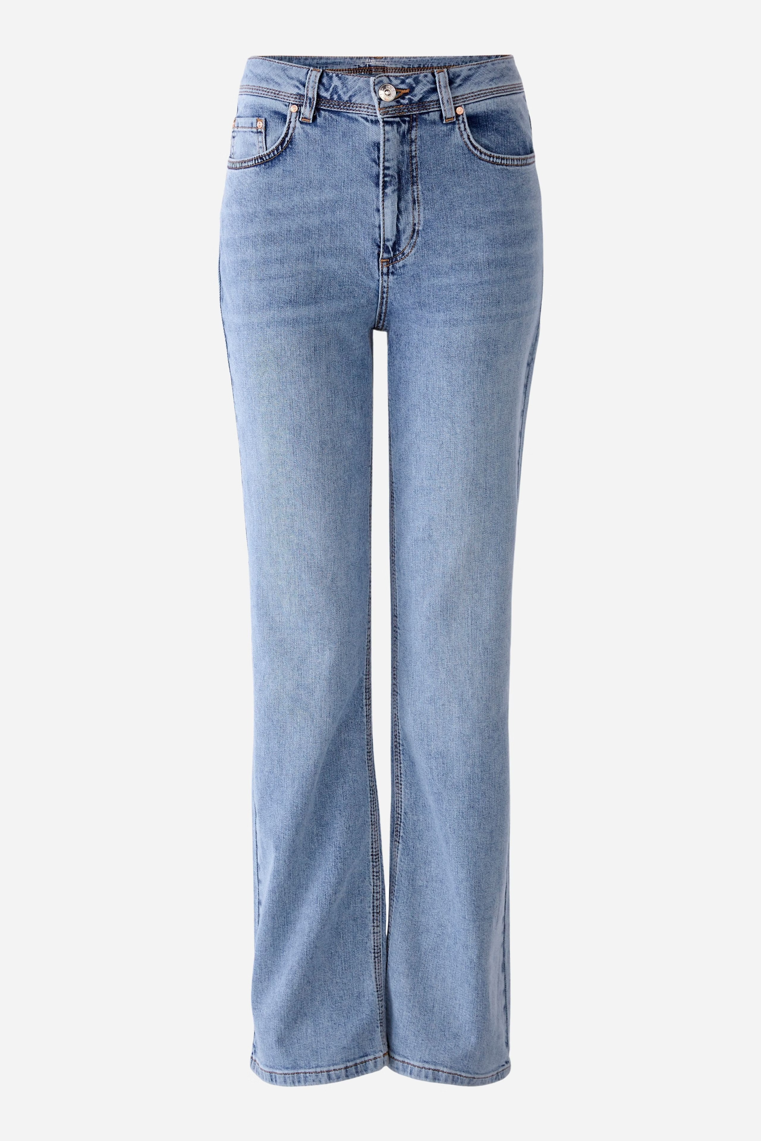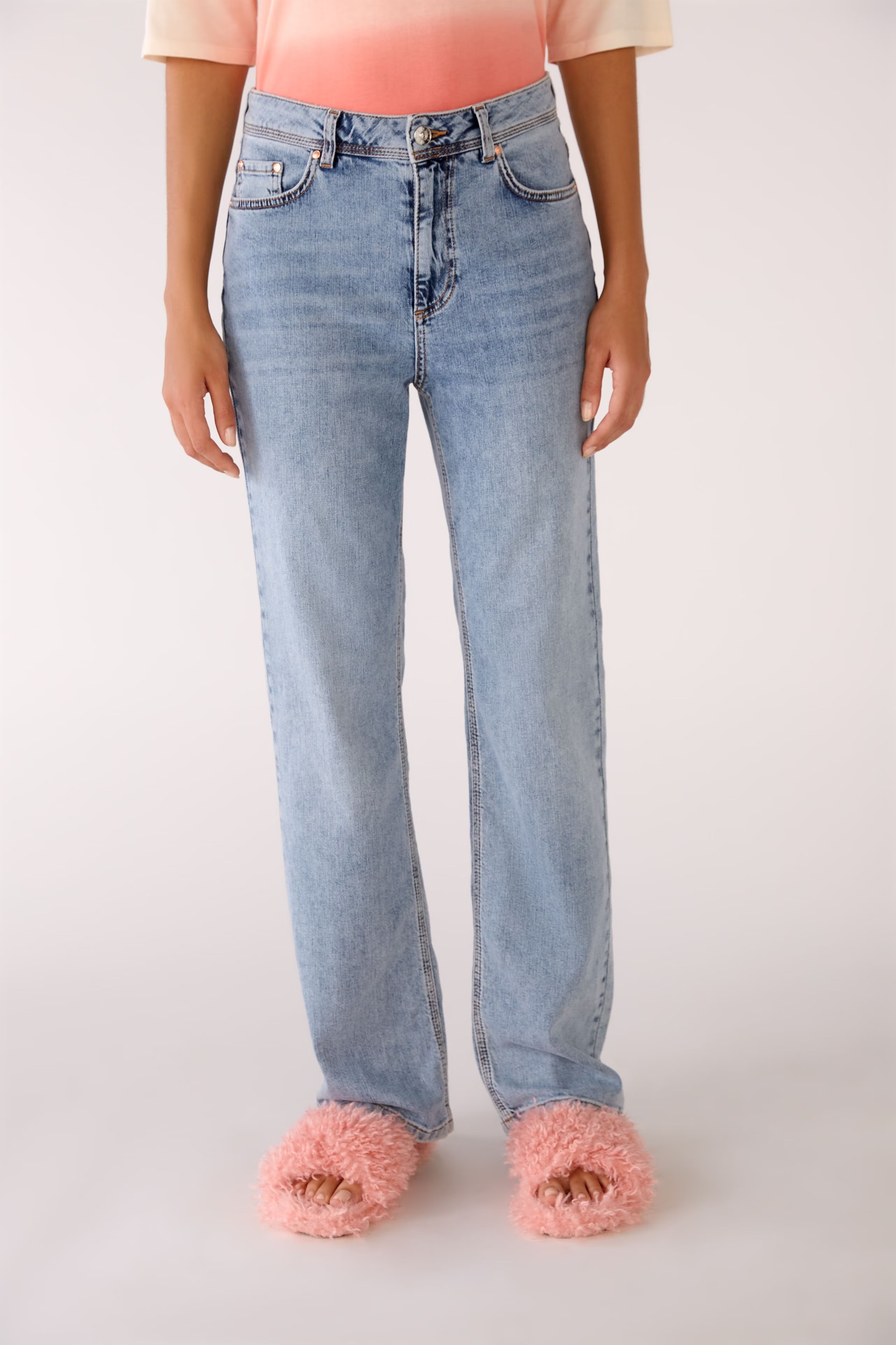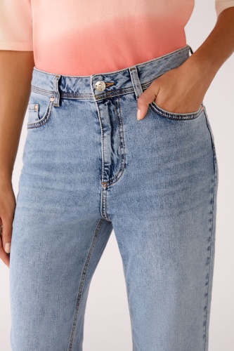 На сайте указаны российские размеры. Прямые джинсы с завышенной талией из смесового денима. Очень крутой и вдохновленный ретро - в эластичном, мягком джинсе в модной, аутентичной расцветке. Современная интерпретация классического кроя, с прямой ногой – завышенная талия. Классический фасон с пятью карманами и характерной контрастной отстрочкой по швам. Кожаный лейбл Oui на поясе. Контрастный принт с надписью на внутренней стороне пояса Длина в размере 42: 80 см. Рост модели 177 см.