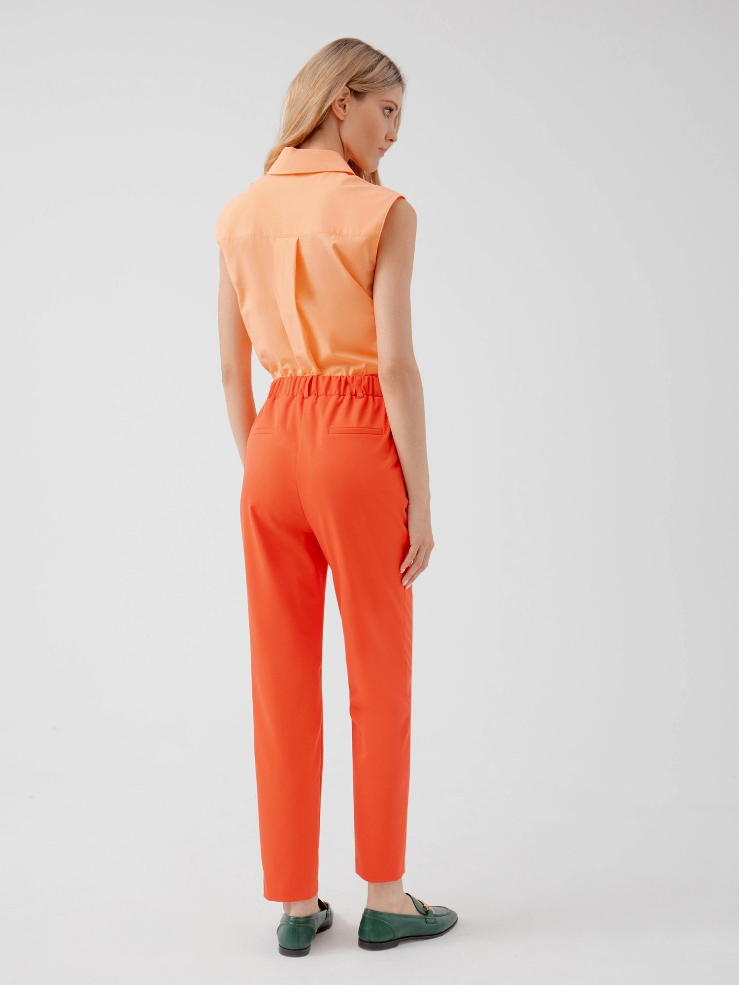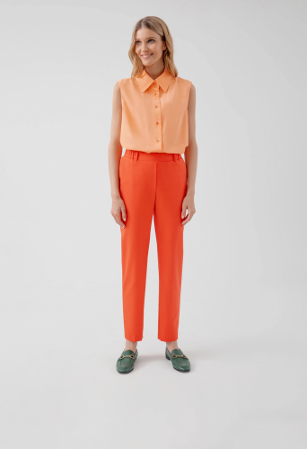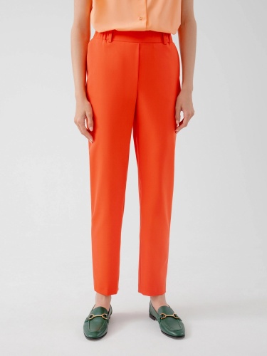 На сайте указаны российские размеры. Брюки из костюмной ткани в ярком цвете "грейпфрут", зауженного к низу силуэта на притачном поясе со шлевками и резинкой по спинке. Брюки с карманами по бокам. Рост модели 175 см.