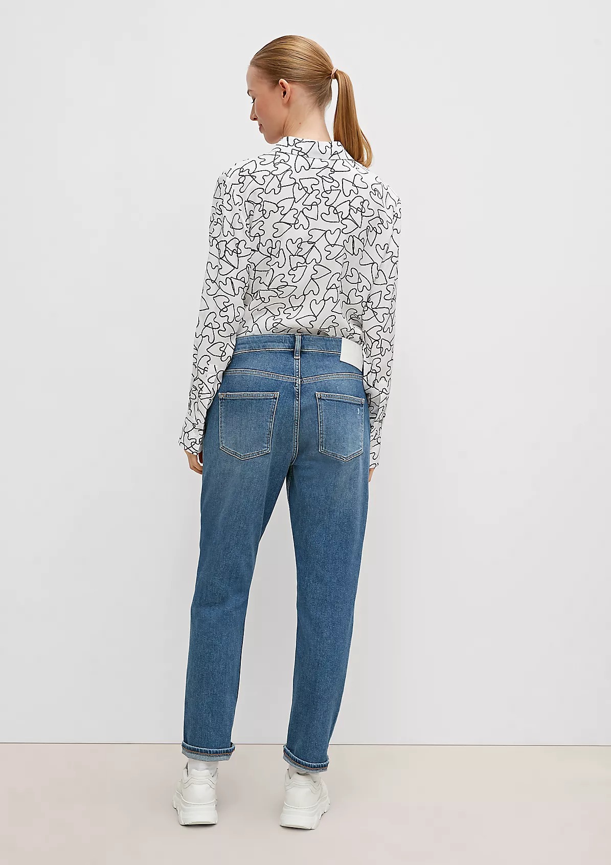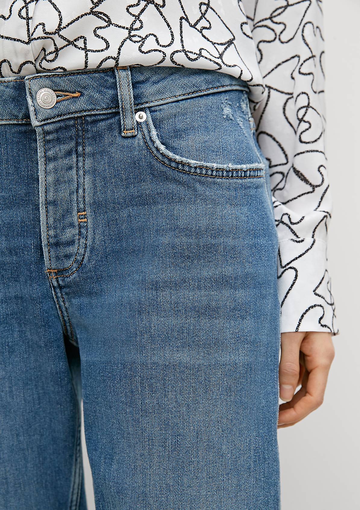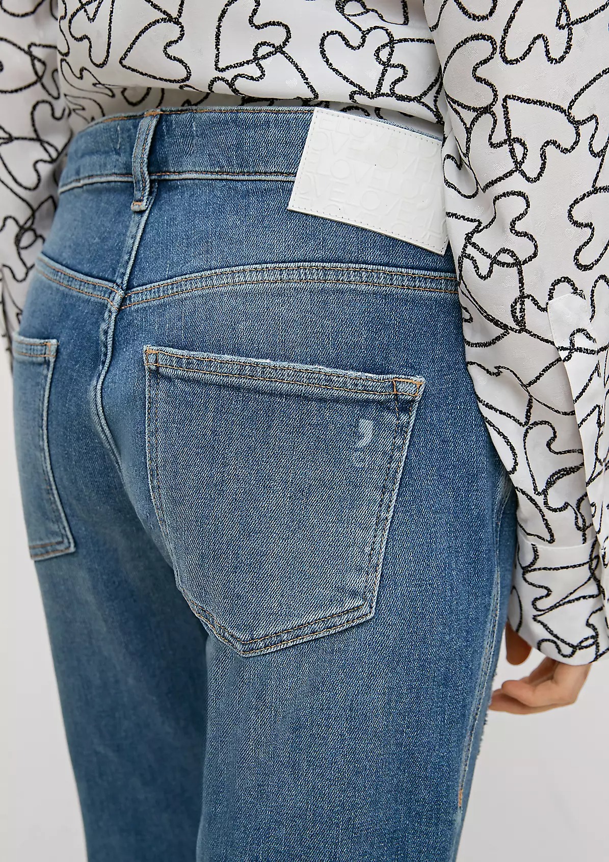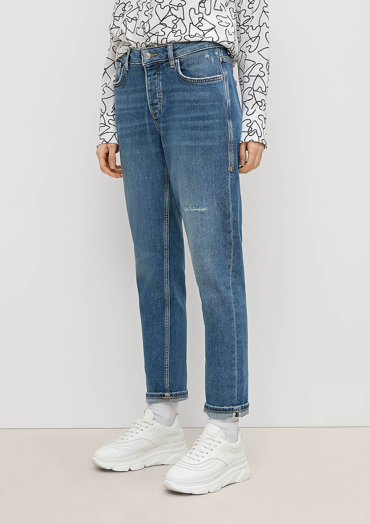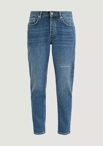 На сайте указаны российские размеры. Джинсы свободного кроя с эффектом потертости. Застежка на кнопки. Длина штанины по внутренней стороне для размера 42 около 74 см. Рост модели 178 см.