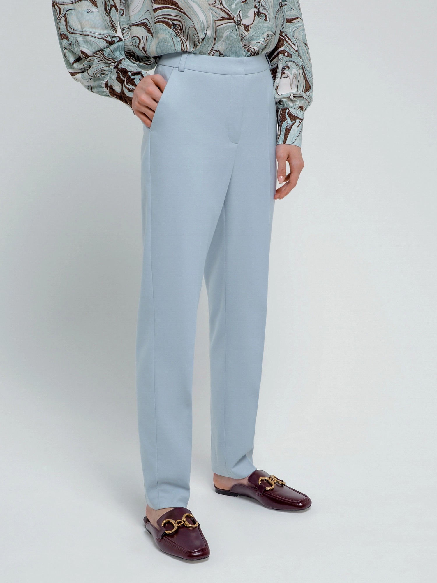 На сайте указаны российские размеры. Брюки со стрелками из костюмной ткани зауженного к низу силуэта на притачном поясе со шлевками. Спереди боковые карманы и застежка на молнию и крючок. Рост модели 175 см.
