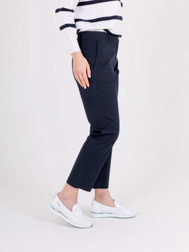 Прямые брюки с завышенной талией длиной до щиколотки с застежкой на молнию и 1 пуговицу. На передних половинках расположены два кармана с отрезным бочком. На правой задней половинке прорезной карман «в рамку» с прорезной петлей и пуговицей, для фиксации кармана. Верх брюк обработан поясом со шлевками.