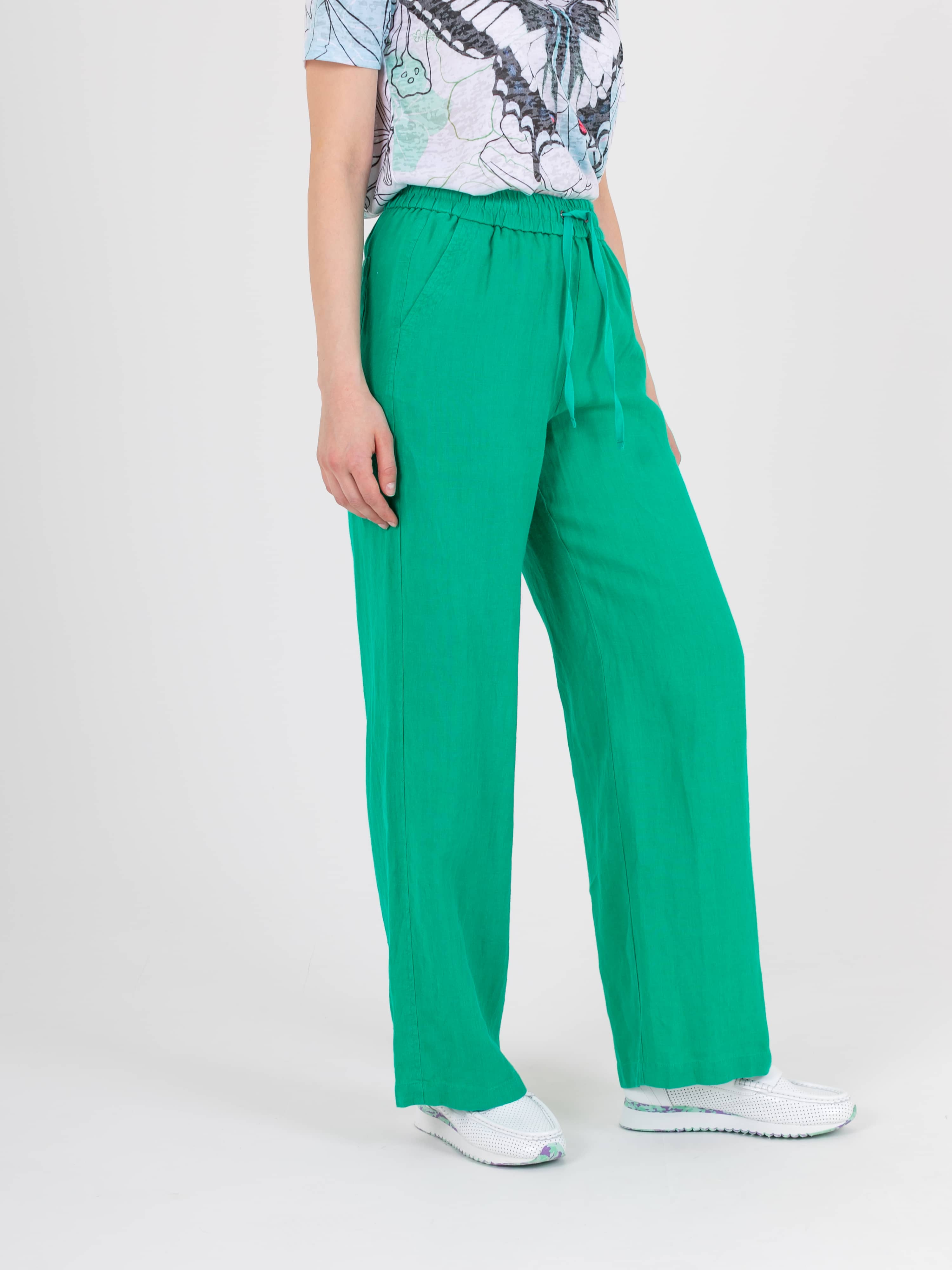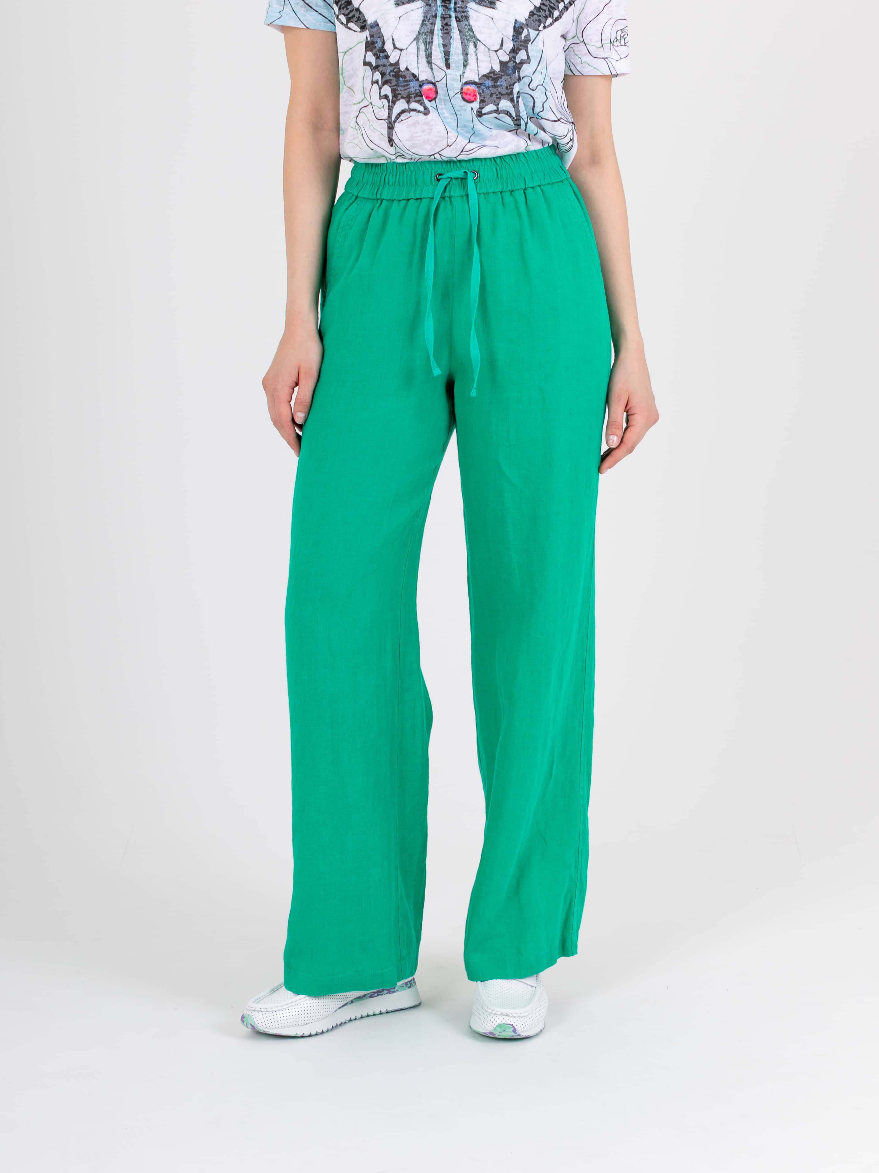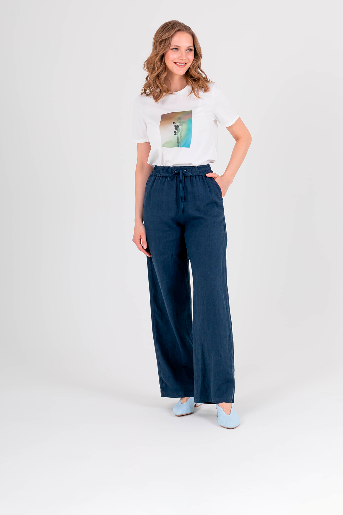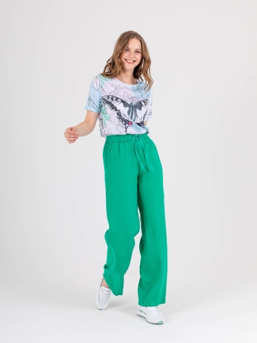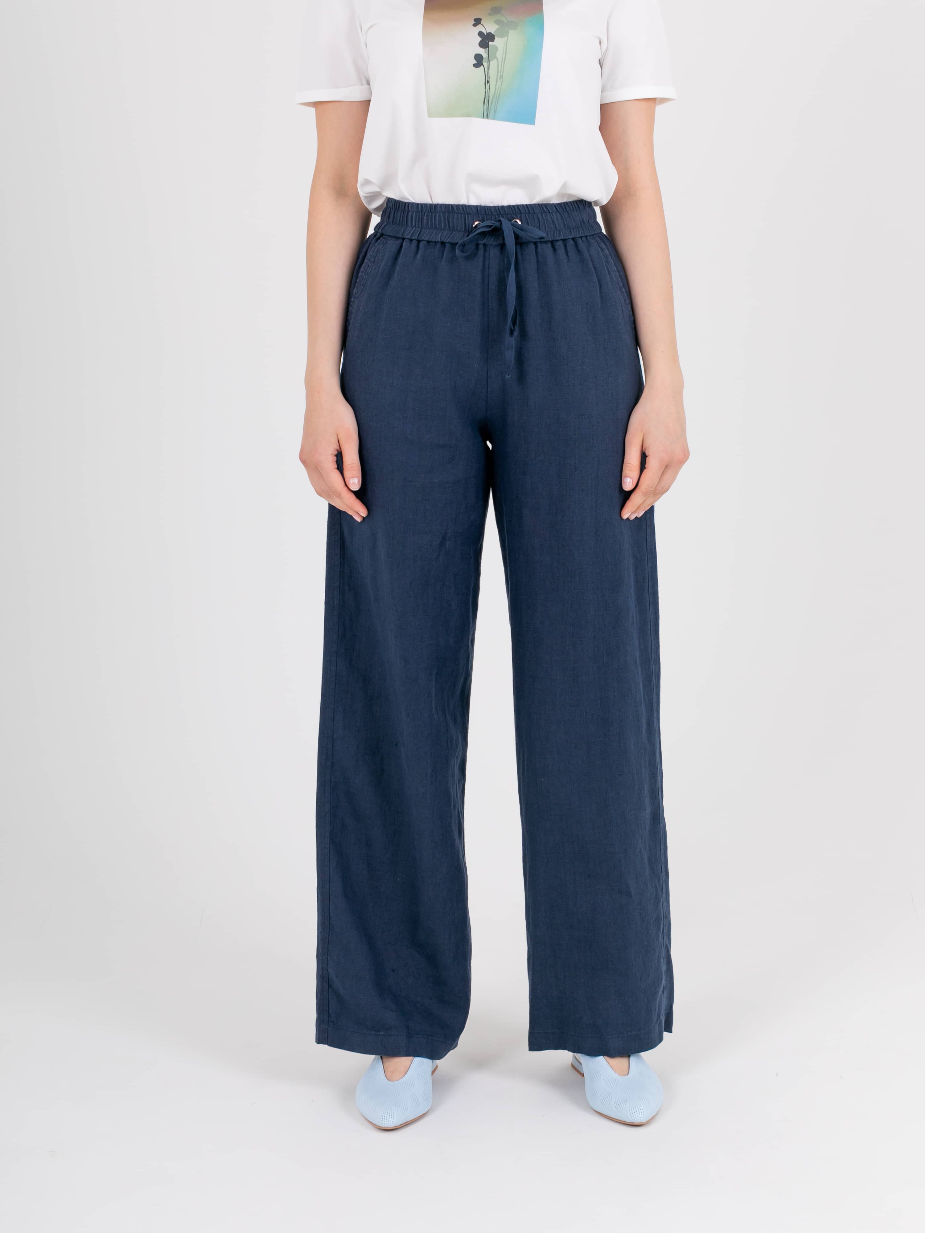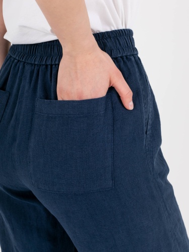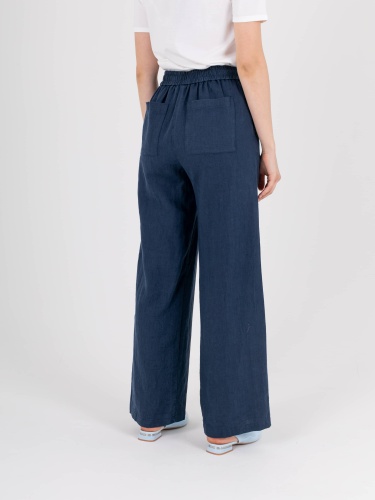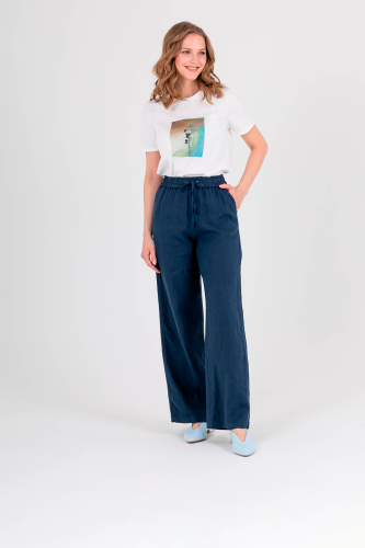 Прямые удлиненные брюки «трубы» из натурального льна. На передних половинках расположены два кармана с отрезным бочком. На задних половинках брюк расположены накладные карманы. Верх брюк на резинке со шнуром для регулировки объема.