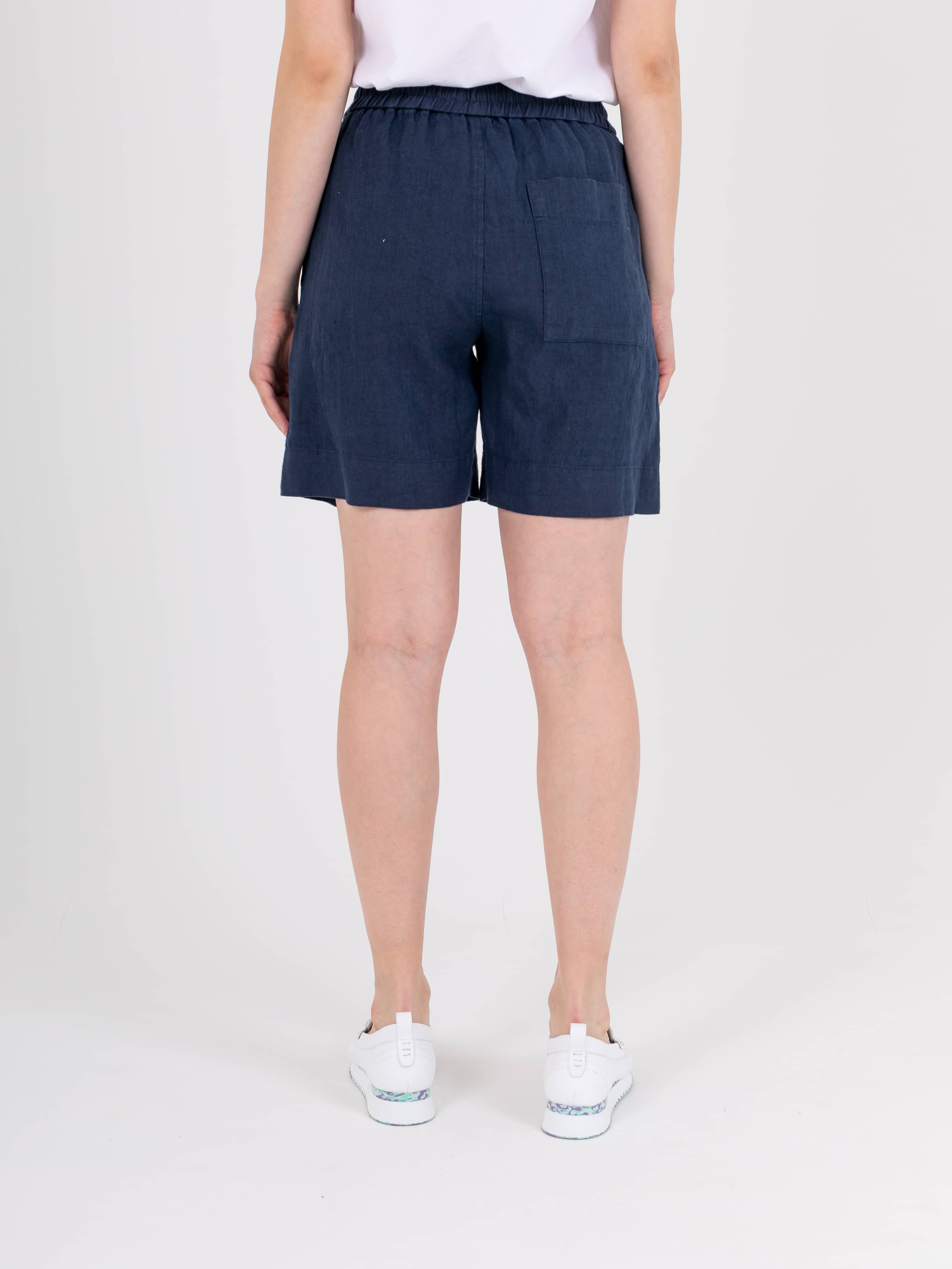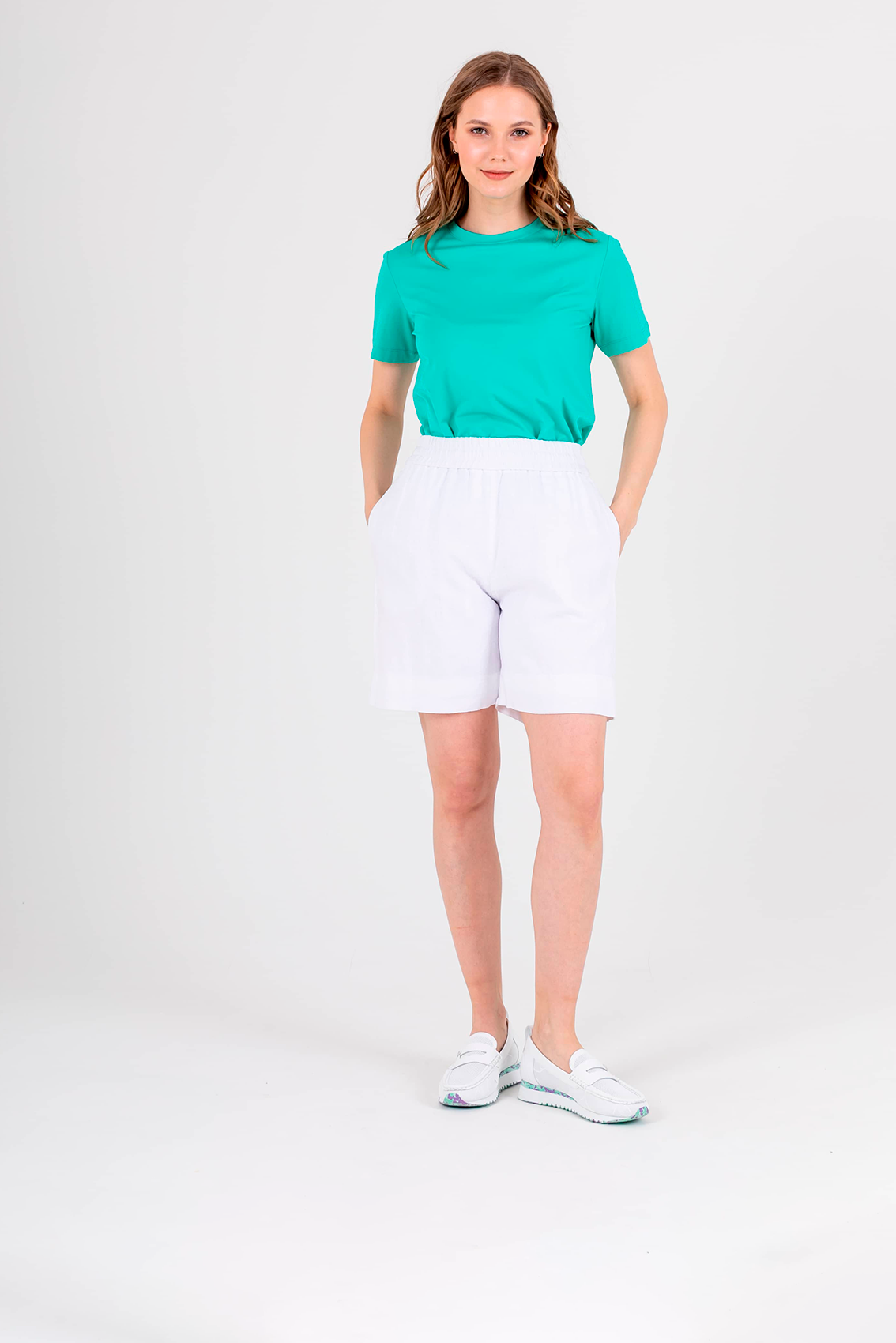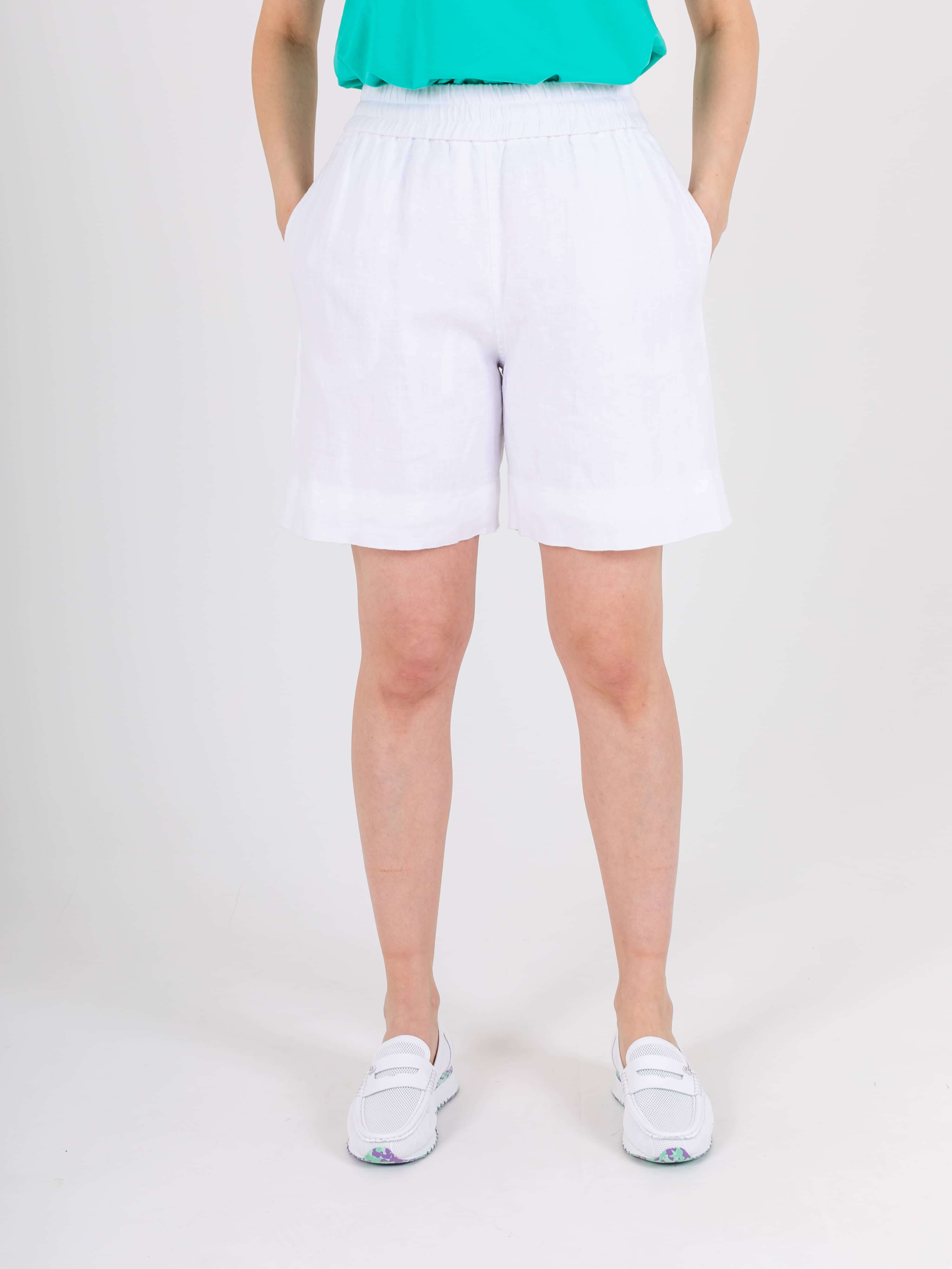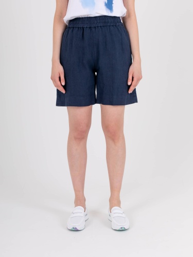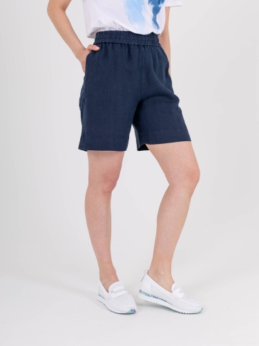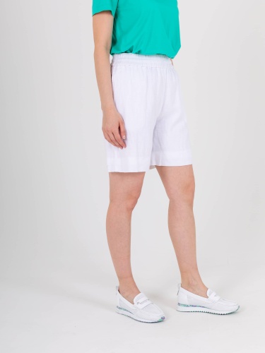 Прямые шорты-бермуды, длиной выше колен из натурального льна без застежки с карманами в боковых швах. На правой задней половинке накладной карман. Верх шорт обработан поясом на резинке.